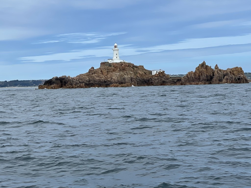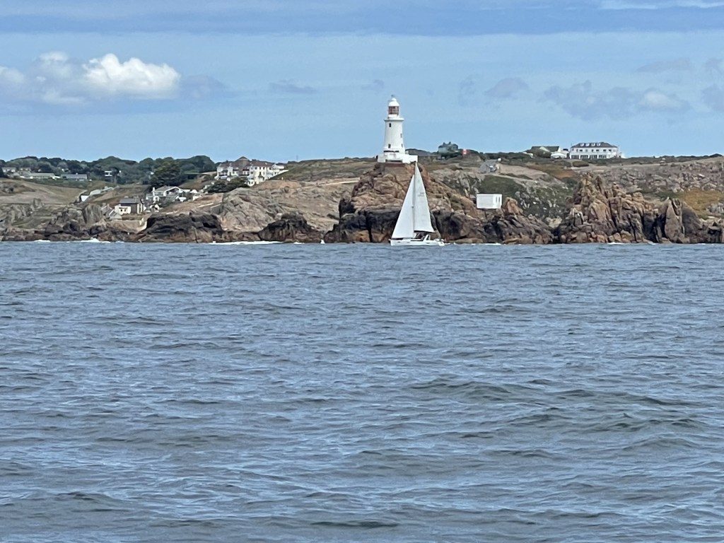 The day started well. We had been hemmed in by the French boat outside of us and two relatively large motor boats behind us. The French boat left at 0500. I got up to lend hand as he was sailing single handed. `By the time we came to leave, both boats behind us had gone. A dream departure for us. This was going to be our first racing start of the cruise – just outside the harbour. We were revved up to compete! Racing timer was on, mainsail was up just waiting for the start signal. Then ………… we were unable to get the foresail out, the furling foresail was jammed solid, not even the electric winch handle could move it. Whilst the boats sailed off into the distance, the toolkit was dug out and I went forward to try and fix the problem on a pice of kit I had no ideal how it worked. After taking out a couple of screws bobbing about on the water I felt this was not a good idea and could end in tears. The risk of losing screws and bolts overboard was too great. So it was back to the cockpit, motor on and motor sail on a single bearing for 19 miles. Not a great experience and it did become a little tedious. We rounded La Corbiere – an impressive headland – and then headed East to Noirmonth Point before heading into St Helier.