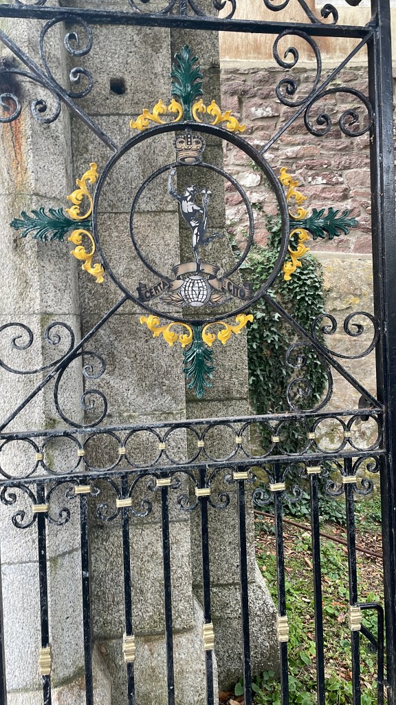 Dinghy was blown up on the back of the boat and we motored into the inner harbour for a walk into town. Up the hill – the very steep and long hill – to the Main Street for coffee and croissant in the cafe. A number of others from the Rally passed us by and stopped for a chat. The cafe thought we must be very important people for so many to know us! We had a little rain as left to search for the Cathedral of the Channel Islands – St Anne’s. In 2000 the Regiment I was commanding – 30th Signal regiment – made a set of church gates to replace the ones that were lost in the 40’s. One was constructed with the Royal Corps of Signals Crest and the other with the rampant lion of the Bailiwick of Guernsey.