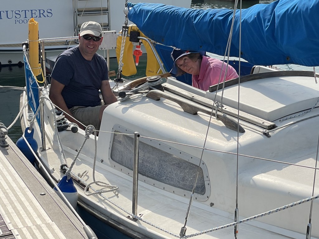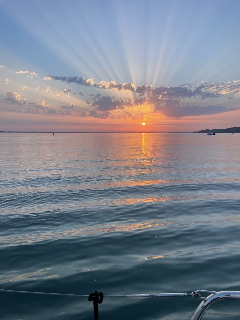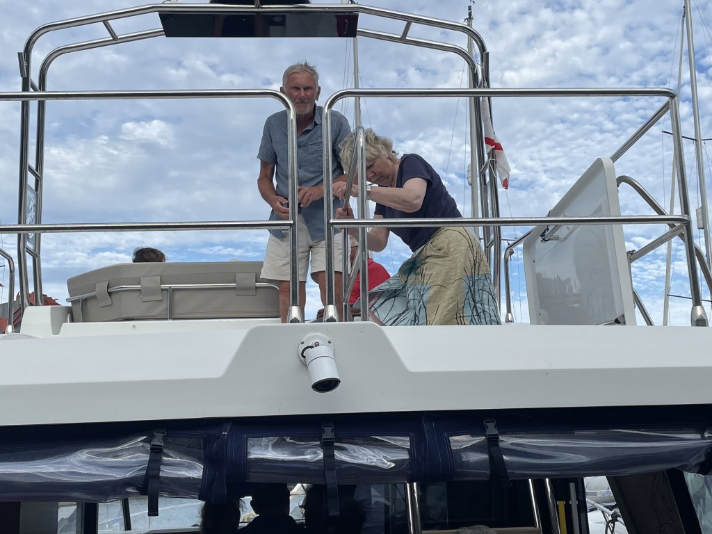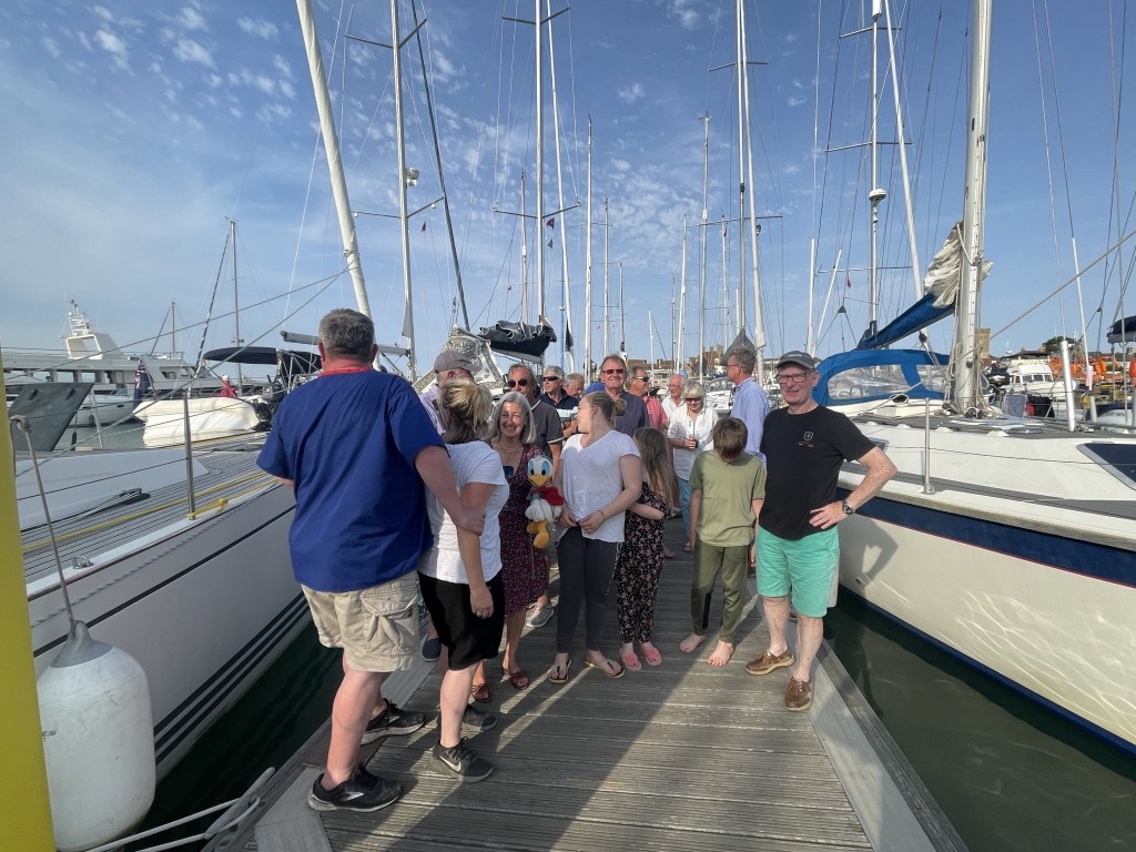 Arrived Yarmouth after an enjoyable and uneventful sail down in completely benign conditions – a bit of a first for us. No tacking down the Solent! Upon arrival we berthed next to Claribel. The harbour launch giving us a helping hand pushing us alongside. A pontoon party in the evening together with a briefing for departure in the morning was organised. it also provided an opportunity to award the Duck for the first time and this was made to Kirsten. Unfortunately Claribel had a bit of a mare with the Code Zero coming down the Solent. Kirsten leapt enthusiastically at the opportunity to scale the mast, at least 3 times, to fix, ably assisted by Clarissa on the winch.
