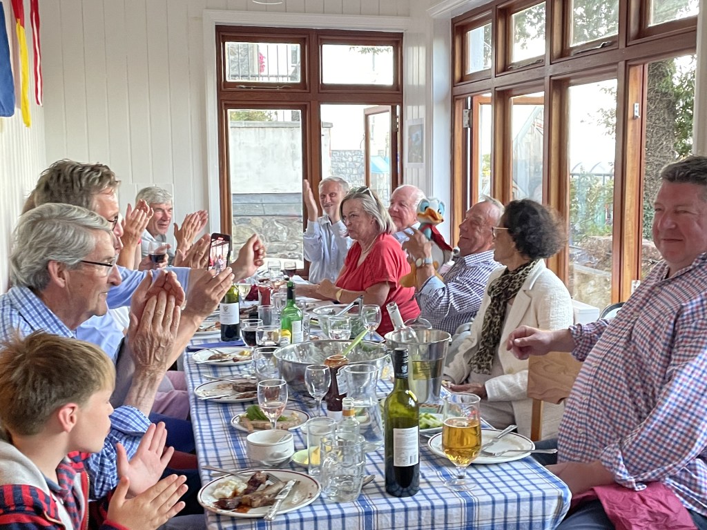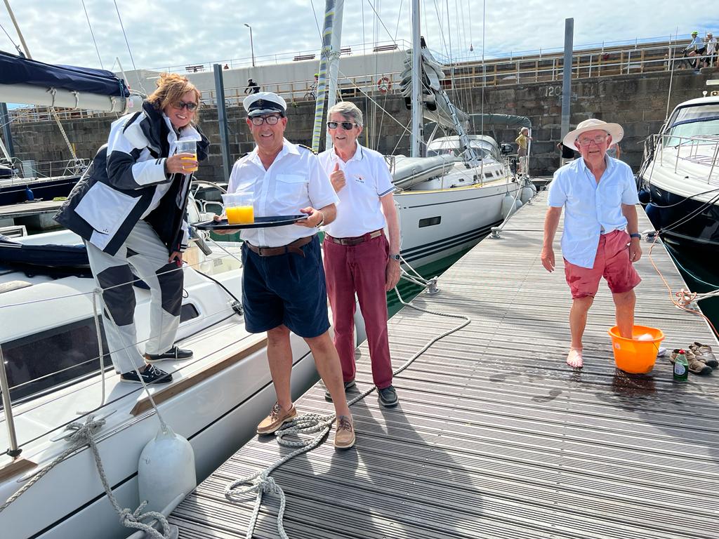The evening meal was in the Royal Channel Islands Yacht Club – unbeknown to many this was formally a chandlery. They were exceptionally welcoming – the entire club run by volunteers. They had laid on for us a BBQ with a crab starter and Guernsey Ice Cream with fruits for dessert. It was very cosy in their dining room but this added to the atmosphere. The food was fantastic – and plenty of it. A lot of banter around the table and bar! The award was made during the meal followed by Bill teaching us the sausage song to a well know Scottish tune. We were all sufficiently inebriated that we joined in with gusto. A tune that was then not forgotten for the remainder of the cruise and became our anthem. Thank you Bill!