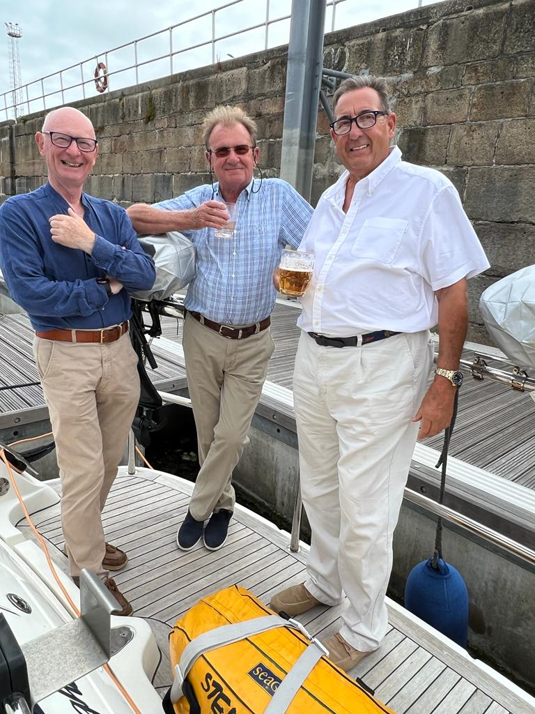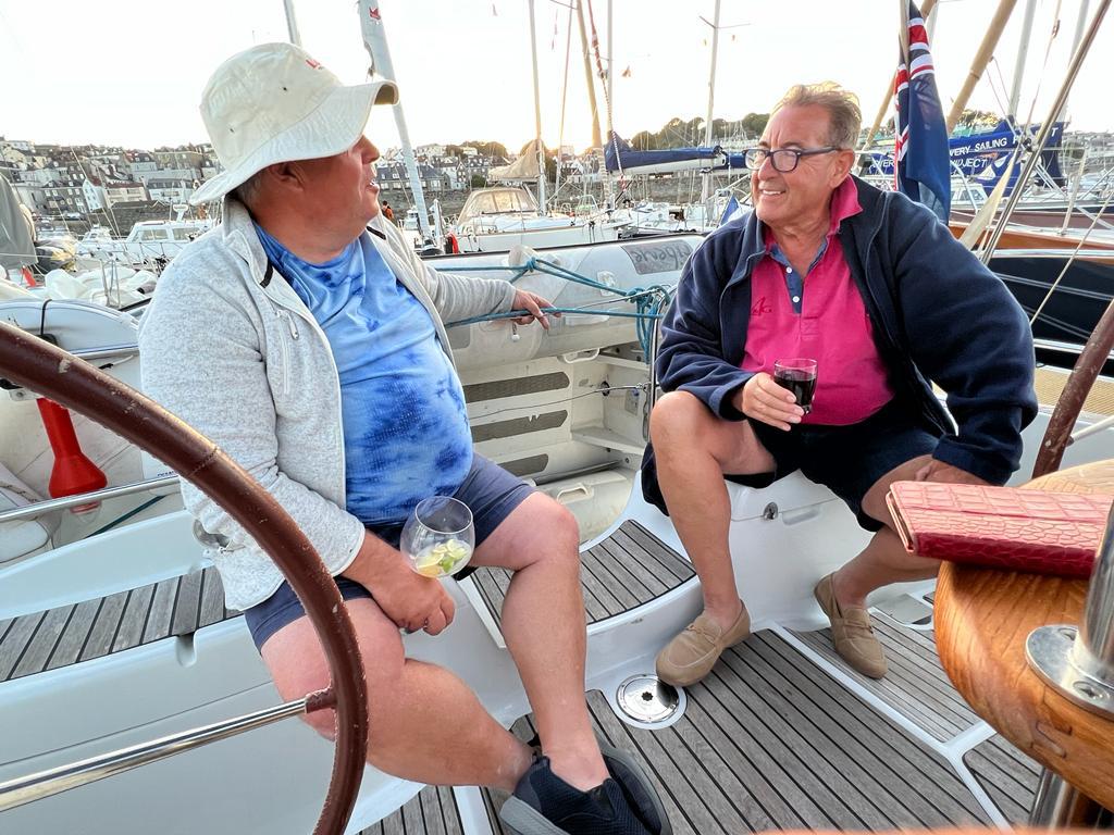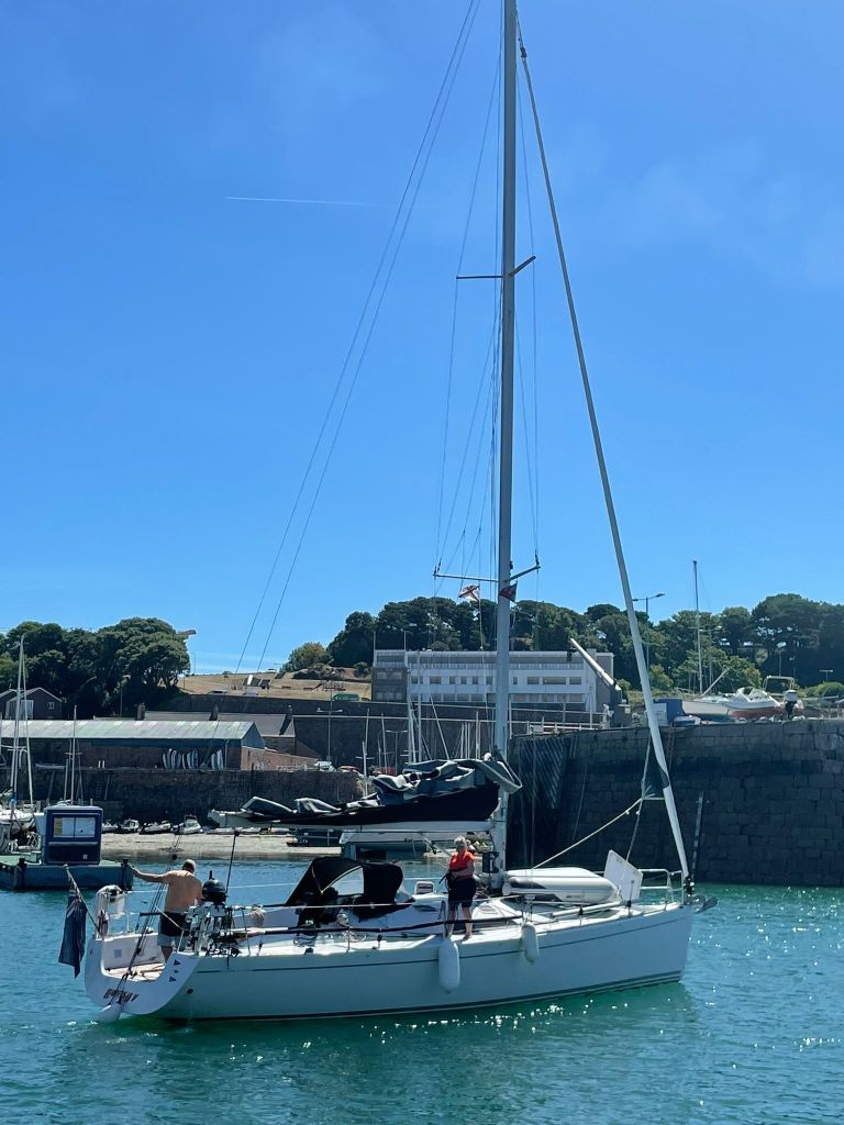 Once in St Helier we refuelled before finding our berth. I had been in negotiation with the marina for some time. There were complications as the main visitor marina did not allow dogs – but there was an alternative for boats with them aboard but this did mean splitting the rally which was not ideal. In St Peter Port I received a message that he could fit us all onto one set of pontoons but it was just outside the marina – for which I opted. But it was a bit industrial and a very long walk to the shows and ablutions. It was a bit of a let down initially but as time went on it was nice to have our own space all together where we could make as much noise as well liked without disturbing anyone! Bill and Ken were quickly on board once docked to help fix the foresail for which we were both grateful.