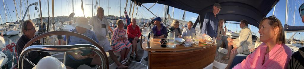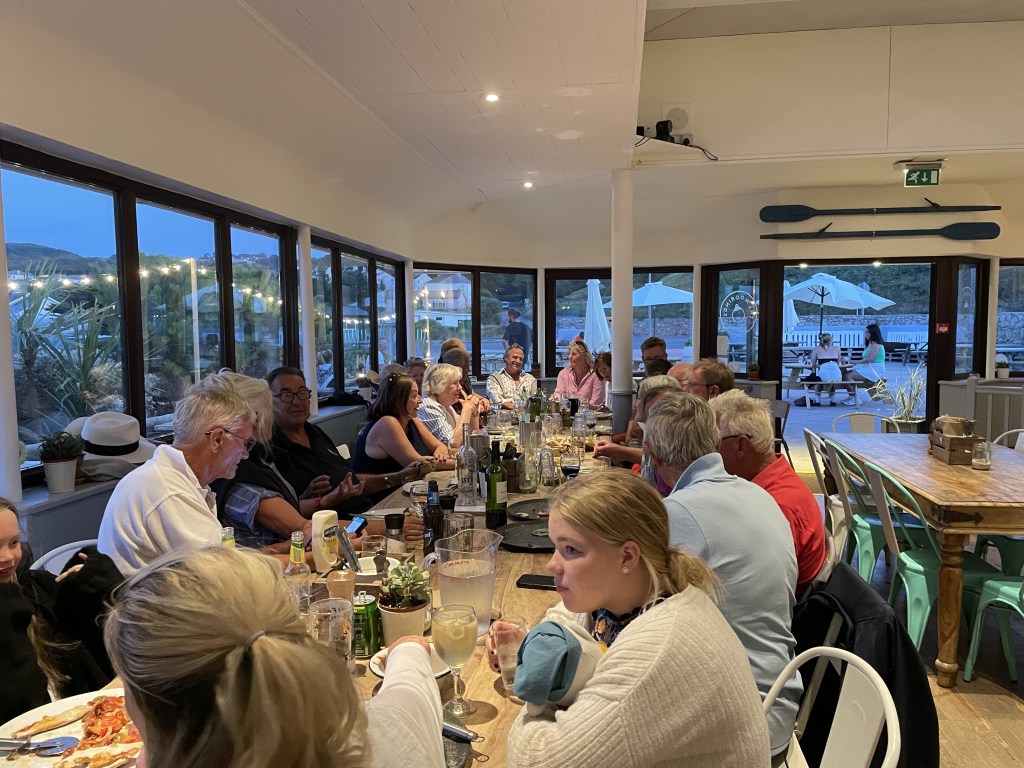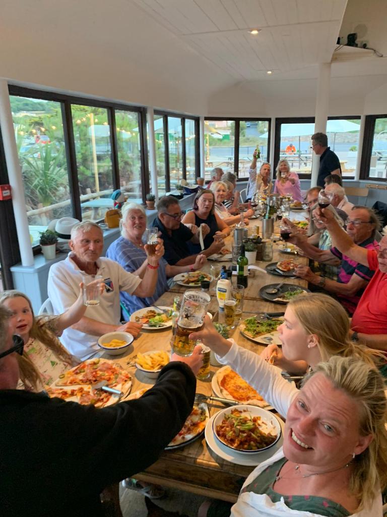 We were going to use the monies left over from the entry fees to offset the cost of the meal. There were some frantic WhatsApp messages to collect everyones choices on a spreadsheet and then share them with the restaurant. Prior to the meal we had drinks on board Stealth of Brighton with Dudley organising the potent rum dark and stormy drinks! This kickstarted off a very memorable evening. We also awarded a ‘cup’ to Oliver and Ingeborg for traveling the greatest distance to join the cruise!