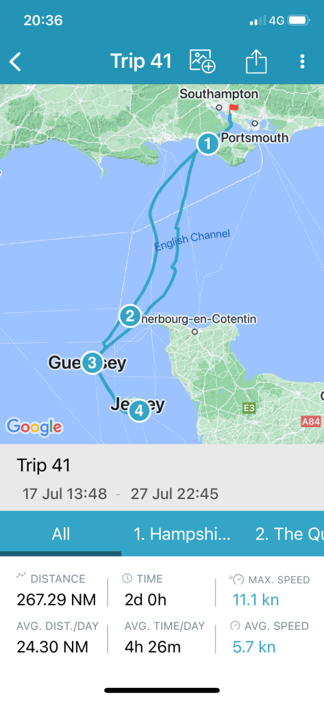 | Monday 18th July | Yarmouth – Braye Harbour Alderney | 0600hrs | 65nm | Moorings, Braye, 1940hrs |