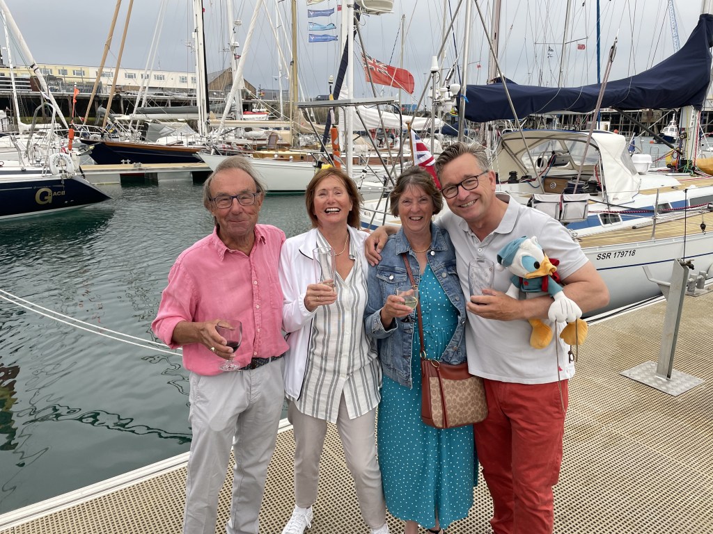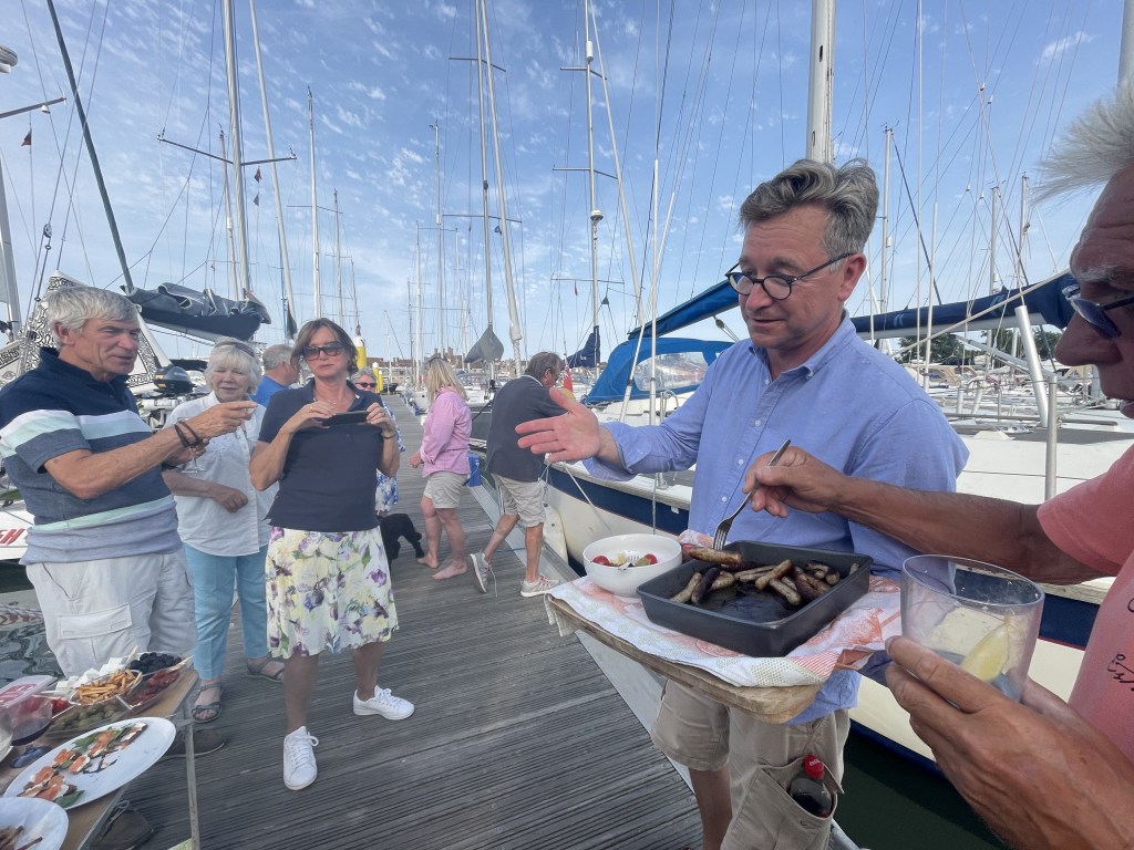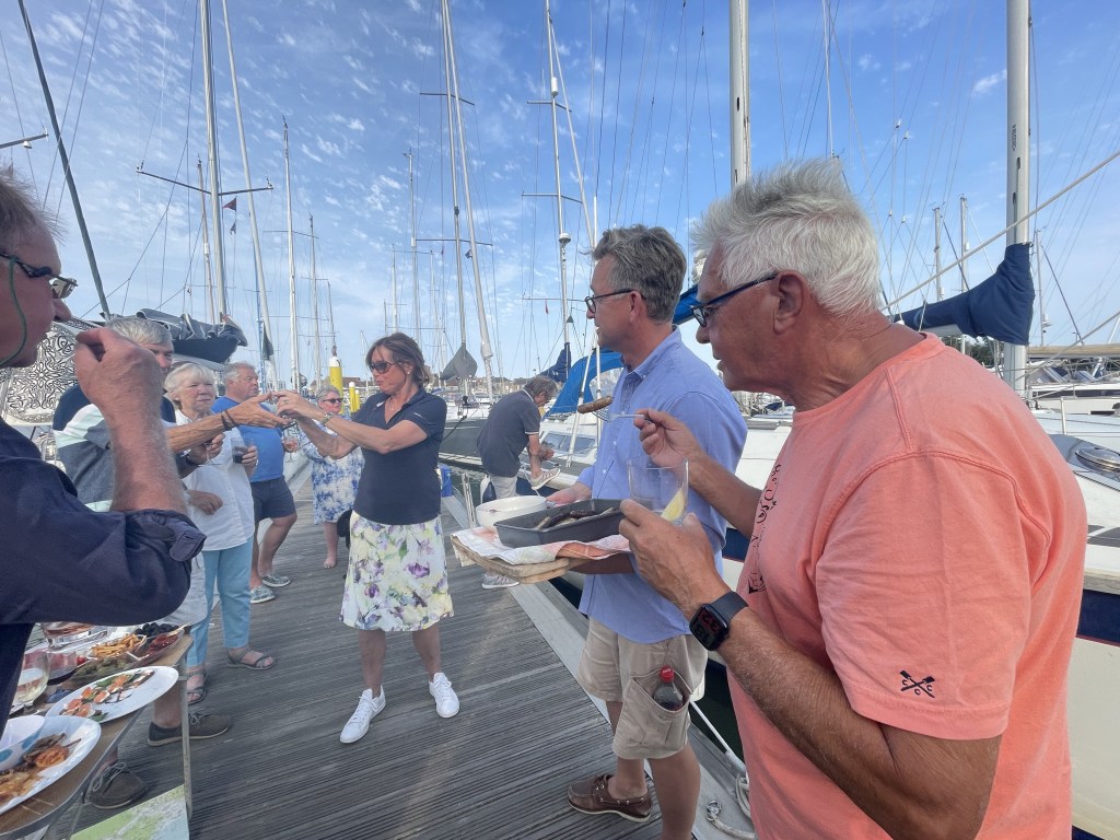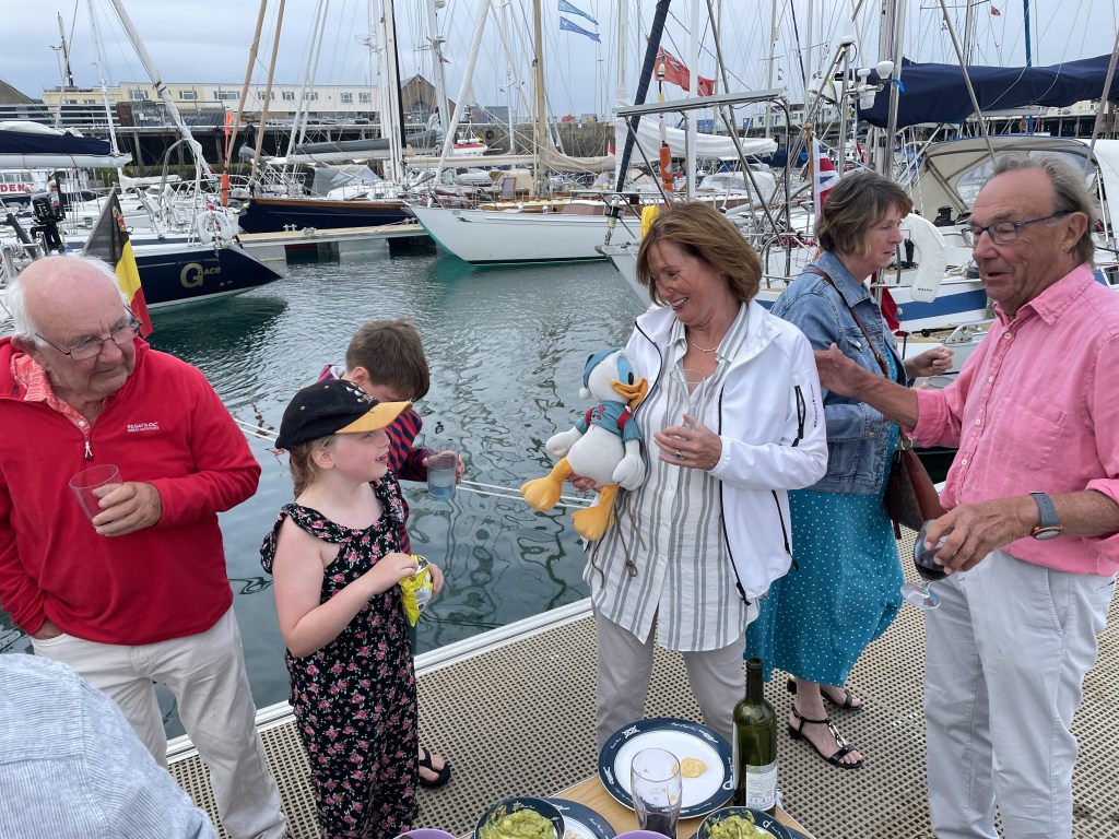 After the disturbed night and early start in Braye harbour we both felt we deserved a breakfast ashore. The local cafe served up an outstanding Croque Monsieur with an egg on top and Gillian had scrambled egg on toast. The portions were a little larger than we had expected. We then had a sleep in the afternoon to make up for the terrible night. In the evening we had pontoon party hosted by Dudley. The table we had carefully packed back at the Hamble was taken out and used for food and drink. The Duck this time was handed over and awarded to Oliver who had navigated the English Channel with no charts, having discovered they ran out at the Needles. He had downloaded Navionics onto his iPhone in Braye only for the phone to disappear into the harbour coming back on the water taxi which itself was a bit of a health and safety nightmare.