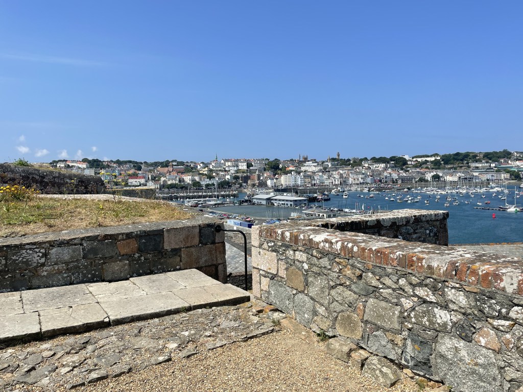 We walked up to the Gardens above St Peter Port for the view, coffee and clear our heads. Another place on the planet that Gillian will not be retiring to given the steepness of the alleys. We thought we were walking to a set of tropical gardens. Sadly whilst we did spot some flowers they were hardly a show case garden. Nevertheless we had a pleasant coffee and tea cake before coming back down and walking to the Castle Cornet where the 12o’clock gun is fired each day. An interesting place built around 1206 when England then ruled Normandy. When Normandy was handed back, we kept hold of the Channel Islands. It was taken by the French for a short period between 1338 and 1348. During WW2 it was taken over by the Germans who made it part of the Atlantic Wall. We did a short walk around, climbing to the very top of the castle but our heart by this time was not in it and we soon wandered back to the boat via a very nice and unexpected fish shop where we bought a beautiful piece of tuna for lunch. Simply fried in butter – it was wonderful.