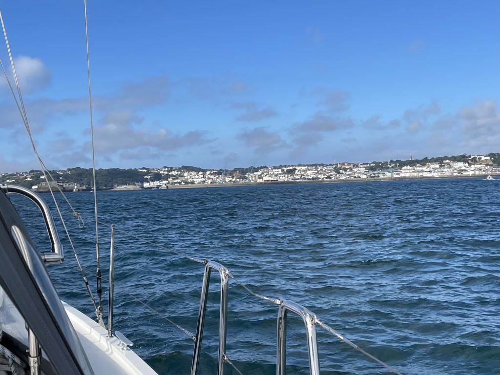 This was an early start – so what is different you may ask! The weather forecast was not great in terms of wind strength and direction so we knew we would have to motor for a fair while. We were up at 0430 and away by 0500. Still dark. Zampa was out before us and we followed. Main up in the outer harbour before we set out for the first waypoint – Corbierre. The wind was as predicted – not very much and on the nose so it was a motor all of the way. The sea was still quite lumpy from the front that had passed through. Gillian had gone down soon after departing – not much point both of us being on deck. But after a couple of hours the wave motion got too much and a visit to the heads on knees was required. Daylight came up in a not particularly spectacular manner – greyish skies. The other boats had departed at the same time and we were soon line ahead to St Peter Port. The exception was Batfish who was having to do all of this under sail with no engine. We were all watching their progress hoping some wind would ease the frustration they were feeling.