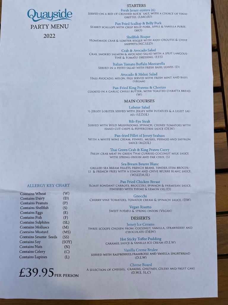The majority went off on a round the Island bus tour that was followed by a game of boules. Gillian and myself started the day with breakfast with Jules, Sarah, Willian, Clarissa and Annabella. They were intending to leave the boat in St Helier and catch the ferry back that night as Jules needed to return to work. Then come back out in a few weeks to pick up Claribel and cruise back in slow time. The morning was spent organising the dinner that evening before wandering around St Helier, stopping at various locations for drinks. We bizarrely also looked for bedding for the boat – not quite sure why – but anyway we failed to find what we wanted. The restaurant we chose was a little up market restaurant but overlooked the marina – Quayside Bistro. The menu looked great and we felt it would be quite nice to have a ‘dress up’ night out as the final dinner.
