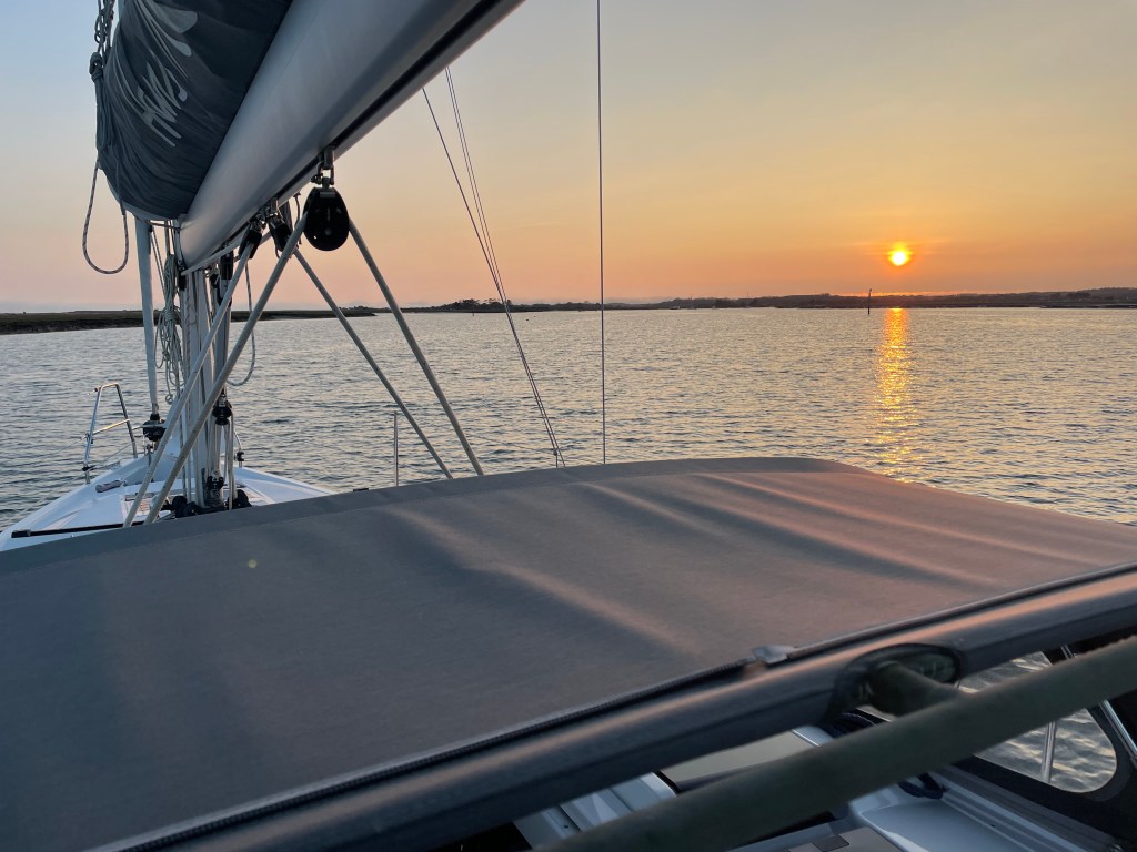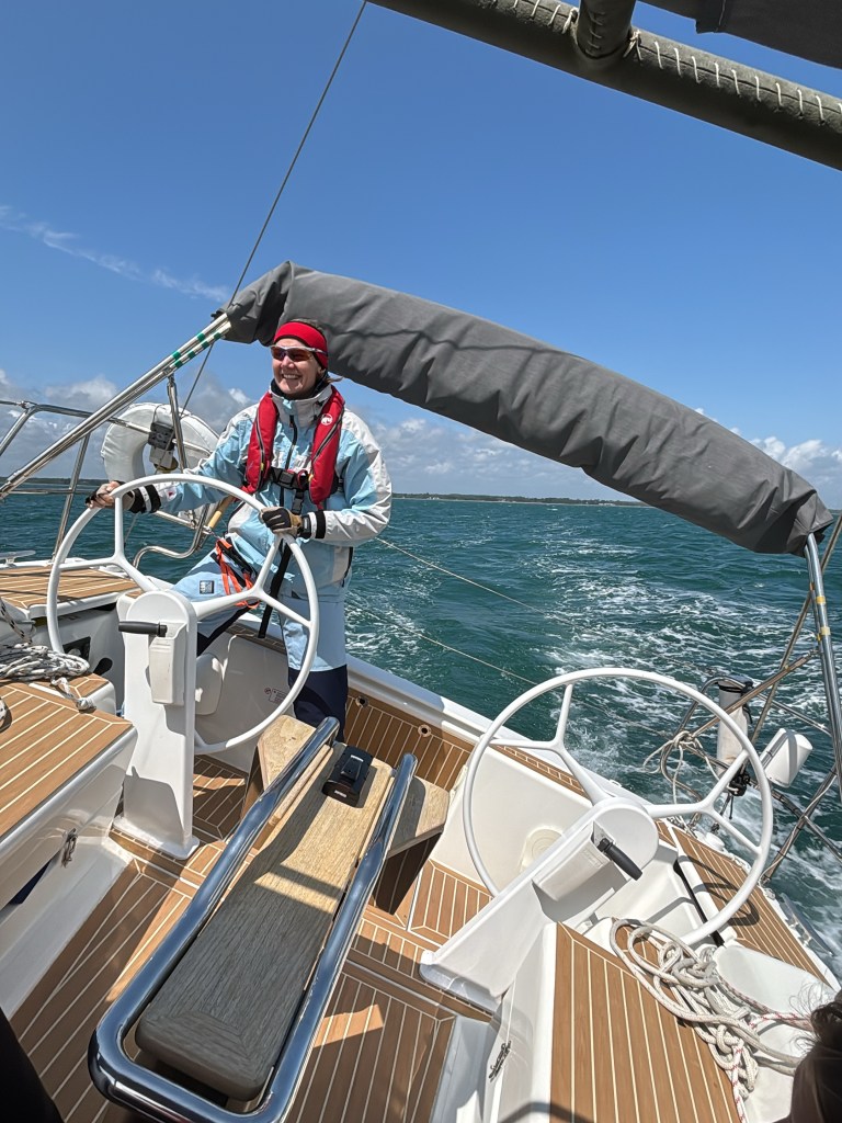 Teri, Penny and Gabrielle joined me for a cruise to Lymington. Yep – again the weather was blustery. This time the pin in the vang sheared. But on the Sunday we had a lovely sail back down the Solent with the cruising chute up and working!