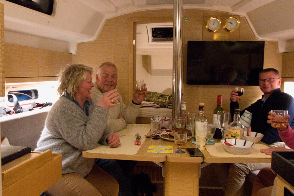 Another blowy outing in 26Kts+. But managed to get to Lymington and all 12 boats made it. Saturday we walked to the Chequers Pub and in the evening had an excellent group supper at the Royal Lymington Yacht Club. Sunday was a sail to Royal Southampton YC on Beaulieu River for traditional Easter Sunday Lunch. Pat and Neil were on board. We had to hang off one of the mid-river pontoons for the evening which was when my old batteries packed up. But new Lithium batteries were on order!