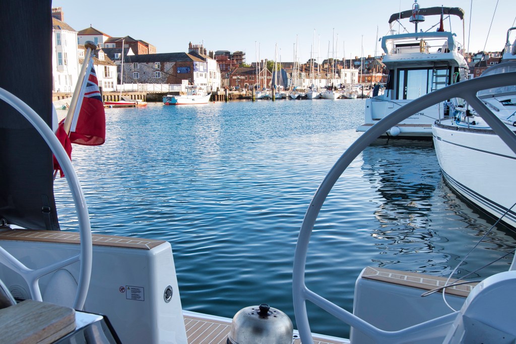 As ever tide dictated departure time. We were aiming to catch the turn of the tide in the Needles Channel and with 40nm to travel we hoped to reach Weymouth in a single tide. We prepared to leave at 0915 with some hesitation. The forecast was for benign winds to blow from NW backing to SW but in Yarmouth they were blowing hard at 18kts. Having had difficulty berthing with the wind blowing us off, when it came to departure we had the easy task of just letting go of the lines and allowed the wind to keep us clear of the pontoon as we reversed back and did a u-turn to exit the harbour.