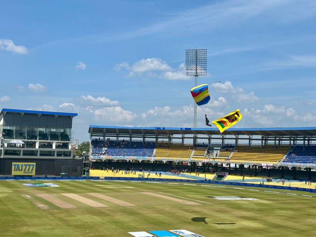 The match started with the Sri Lanka Army Freefall Team parachuting in with the series cup. One did not make it and landed – discretely – on one of the stands roofs. I had not realised that the SL national anthem was so long – we got the one verse of God Save the King – followed by a very extended SL national anthem!