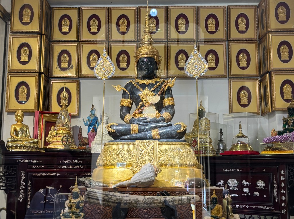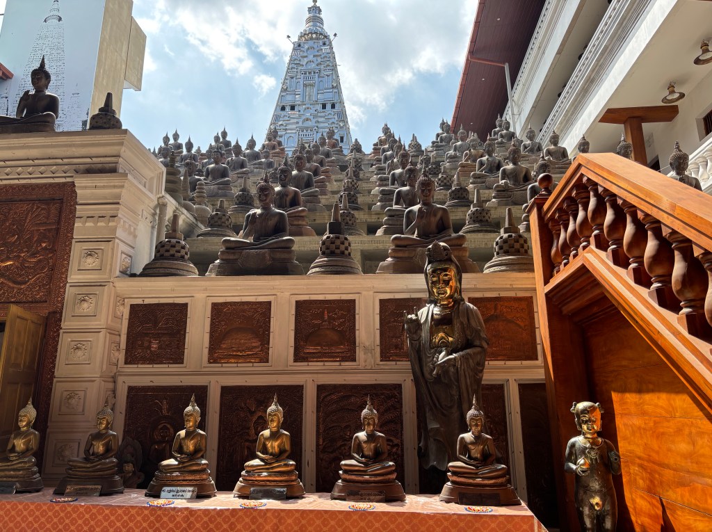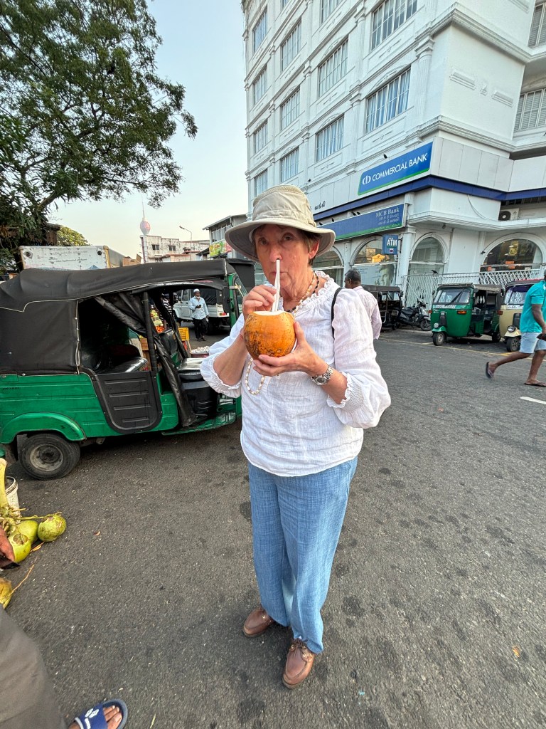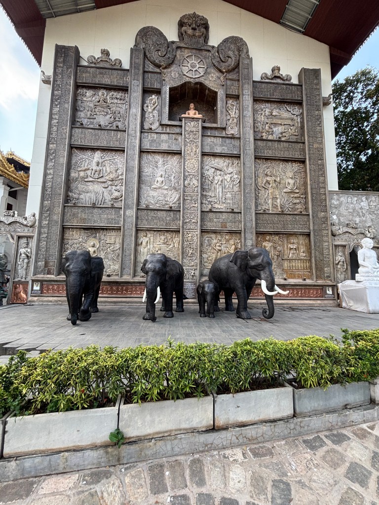 This turned out to be an unexpected and expensive day! We had booked a tour with Deegoda on the With Locals platform. We have found this to be a reliable source of guides when we visit overseas locations – a little expensive but generally you get a great guide who speaks good English and is happy to tailor the trip around what you want to do. Deegoda was not able to pick us up till the afternoon so for the morning we were going to avhe a quite time in the areas of the Dutch Hospital Shopping Centre. We took a tuck tuk from the hotel – the driver usually does city guides but we resisted the offer on the basis we would be doing one with Not Out on the Sunday. There was not much to see at the Dutch Hospital and as we wondered aimlessly around the block we were approached by someone who worked at the Hilton Hotel and recognised the Not Out bag Gillian was carrying. Before we knew quite what had happened we were in a tuk tuc with him racing across Colombo to visit a temple – Gangaramaya Temple. The temples serves as a place of Buddhist worship and a learning centre. The temple is involved in Buddhist welfare work including old peoples’ homes, a vocational school and an orphanage. It was built in the 19th C so not as old as many. But it is a seat of Buddhist learning.