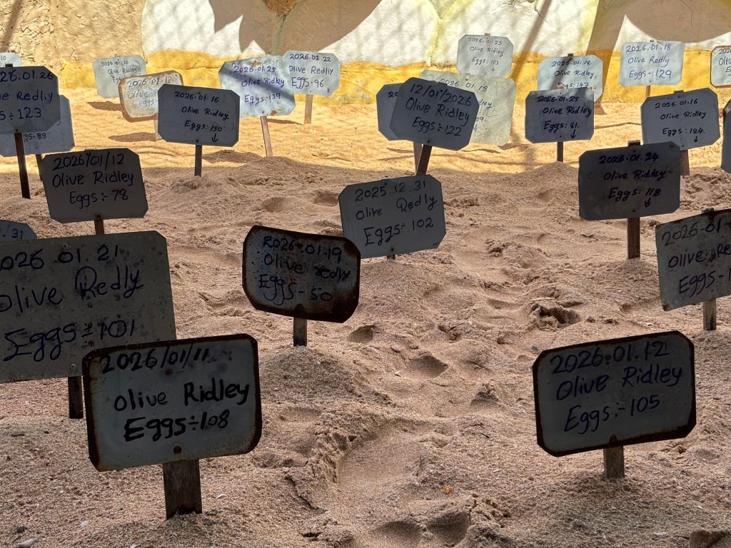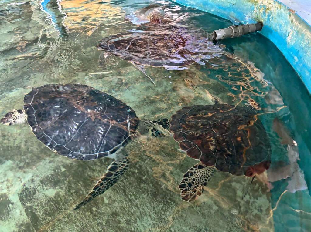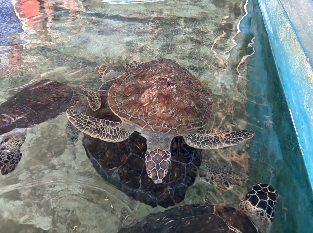 We had a short stop at a charity that rescued turtles. Their main work was harvesting the eggs and hatching them at the nursery to increase the success/survival rates. They lay around 100-150 eggs buried in the sand after first digging false nests to try and fool predators. The survival rate is very low -2% due to birds, and other land preditors including dogs and monitor lizards. Locals also dig up to sell as turtle eggs in some cultures is viewed as a delicacy. The nursery offers to buy the eggs from the locals rather than them selling them on to middle men. They are then buried in sand at the nursery and released into the sea around 3 days old. Survival rates are still not great – around 20%-30%. But a critical period has passed as the shell whilst not fully formed stops fluid leaking from the equivalent of their belly button which attracts predators in the water. The nursery also takes in injured turtles generally as a result of fishing nets, plastic and injuries from boats.