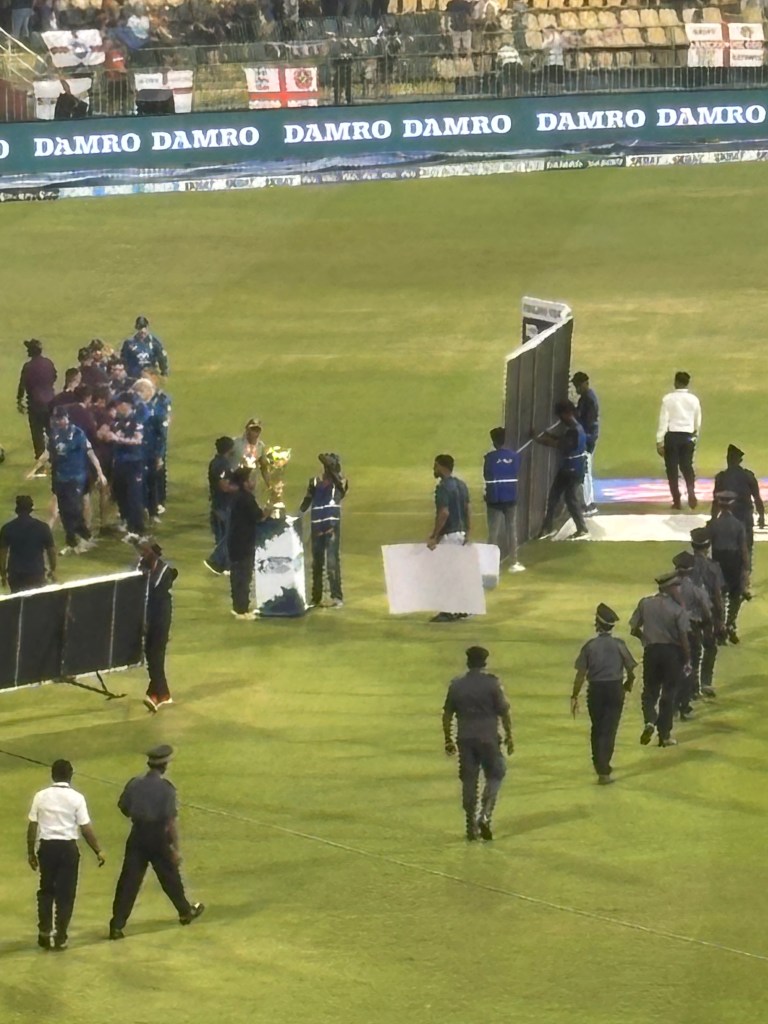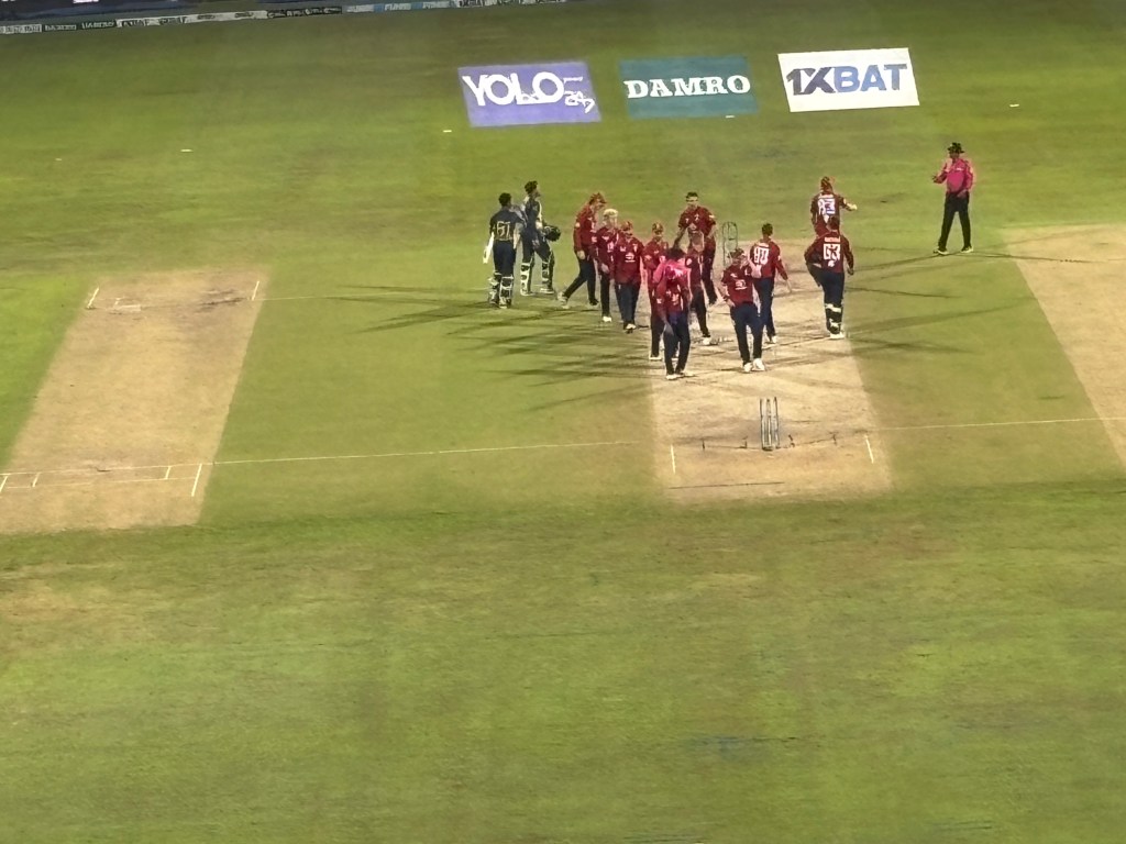 Play was delayed till 2040 and consequently we lost 6 overs in the match – each innings being reduced to 17 overs. It was impressive to see how many people were involved in removing the covers manually. The entire field was ready within about 30 minutes. England won the toss and decided to field first. We were sat next to three Sri Lankans who were simultaneously watching the Australian Open Semi-Final between Sinner and Djokovic. Djokovic won.
