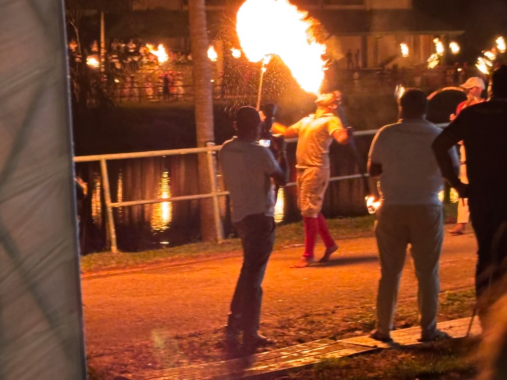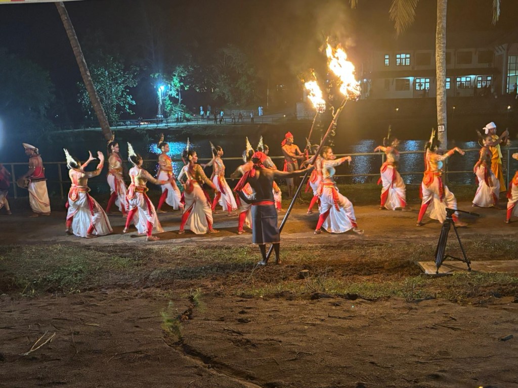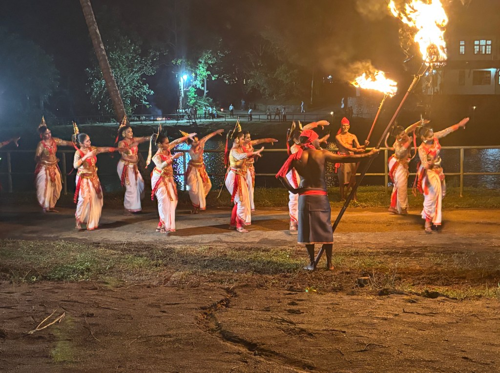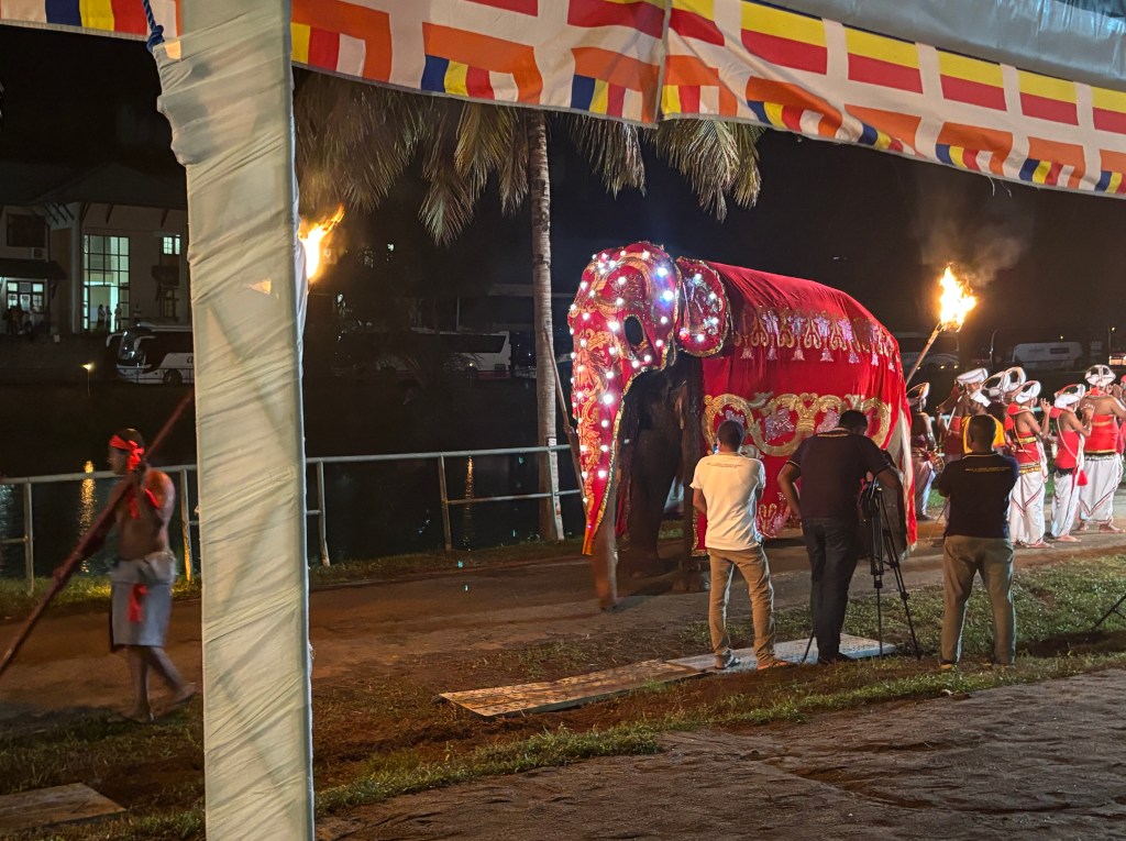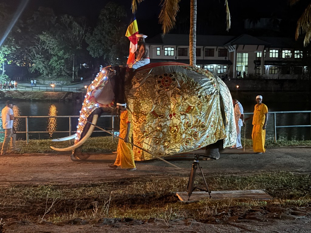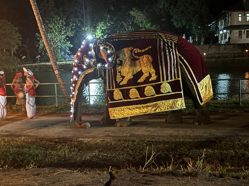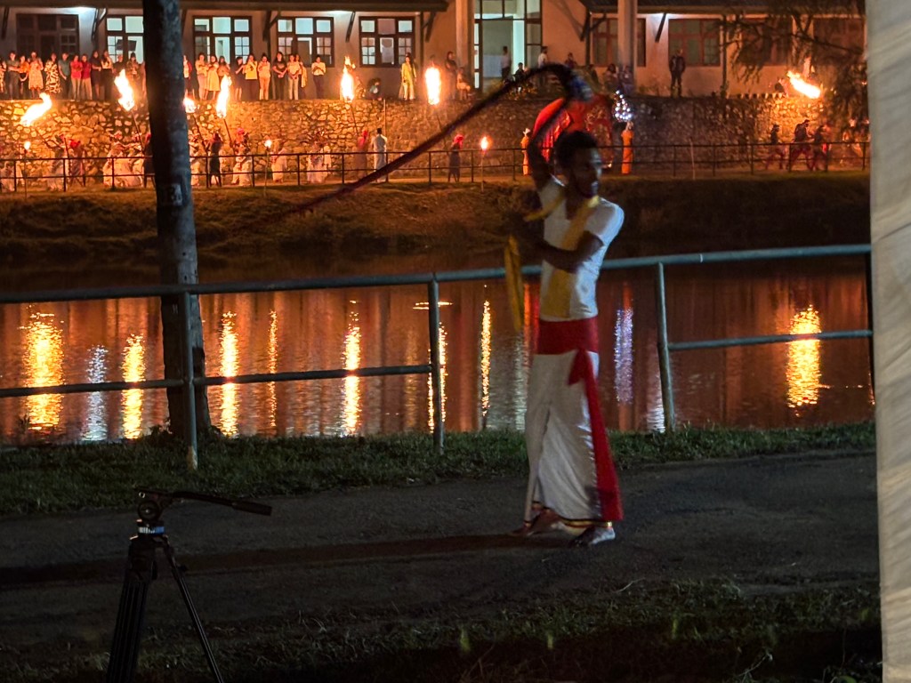 This took place at the Buddha University just outside Kandy. The Esala Perahera is an annual ceremony that takes place around August each year. I got a sense it is like our Easter, the exact timing is linked to a seasonal activity/moon state. The ceremony dates back to 3rdC BC. The present form of the Perahera dates back to the period of the Kingdom of Kandy; and the tradition of parading the Sacred Tooth Relic is over 1,500 years old. The event is a fusion of two different ceremonies – the original seeking the help of the rain gods for the coming rice season and the second to honour the Lord Buddha of which the tooth is seen as representing the living person of the Lord Buddha. The actual ceremony takes place over 12 days and this evenings performance was a mini-dress rehearsal put on for us.