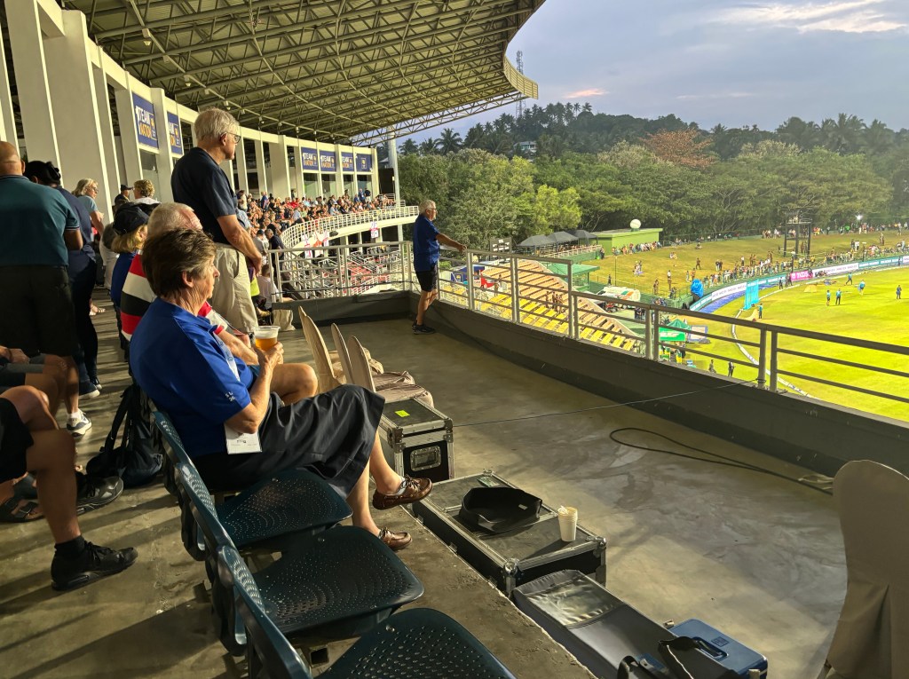 The game started at 1430 local time to accommodate TV – all matches being day/night. After queuing for some time we eventually got into the stadium where great seats had been reserved for the group in the stand that was more or less behind one of the wickets. With the match ticket you got 3 vouchers each for free drinks. It was clear that Sri Lankans like hot dogs – virtually every food stall served them. We went for the deep fried chicken burger. Surprisingly this was lovely. It was not reconstituted chicken – but actual chicken and was a great fillip at change over of innings – around 6pm. Crowd was mainly UK but a reasonable number of locals. It was a working Thursday and hence the low local turn out.