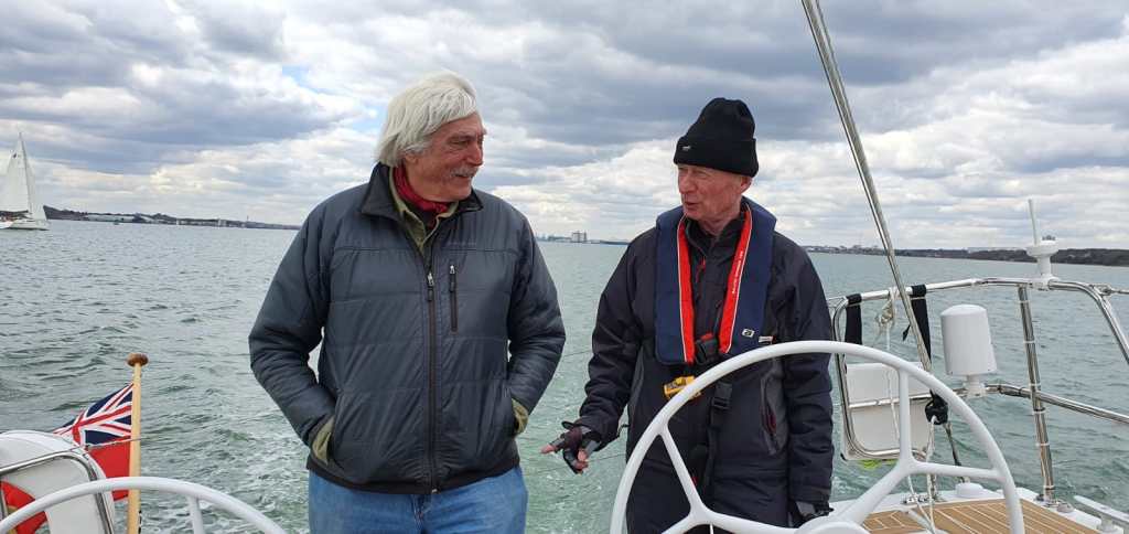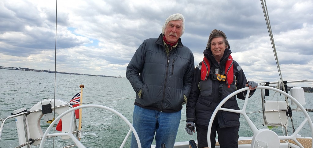 It would be fair to say it was not a warm day! Wrapped up in coats and gloves at the Gaff Rigger for coffee before we started and a bacon butty shared between us put us both in a more optimistic mood! Departing with Tom went well with a reverse out and no paint scratched. The day was spent in Southampton Water adjusting sails, playing with the reefing system, tacking and gybing. Lunch was as they might say in Yorkshire, a grand affair on one of the pontoons in the Hamble. A Gillian special of an all in one pot of beef stew – probably has a much posher name than that – but it satisfied us all as stories were swapped down below. We did discover 3 things; winches were underpowered which required much luffing up to get the mainsail with the right tension, the ‘German’ main sheet has been mounted on the boom too far forward and the friction in the in-mast reefing could not be winched out from the cockpit. So…….. as I explained to Gillian not the gadgets I was wanting to buy were completely vanity projects! We returned home that night somewhat exhausted despite a short days sailing.