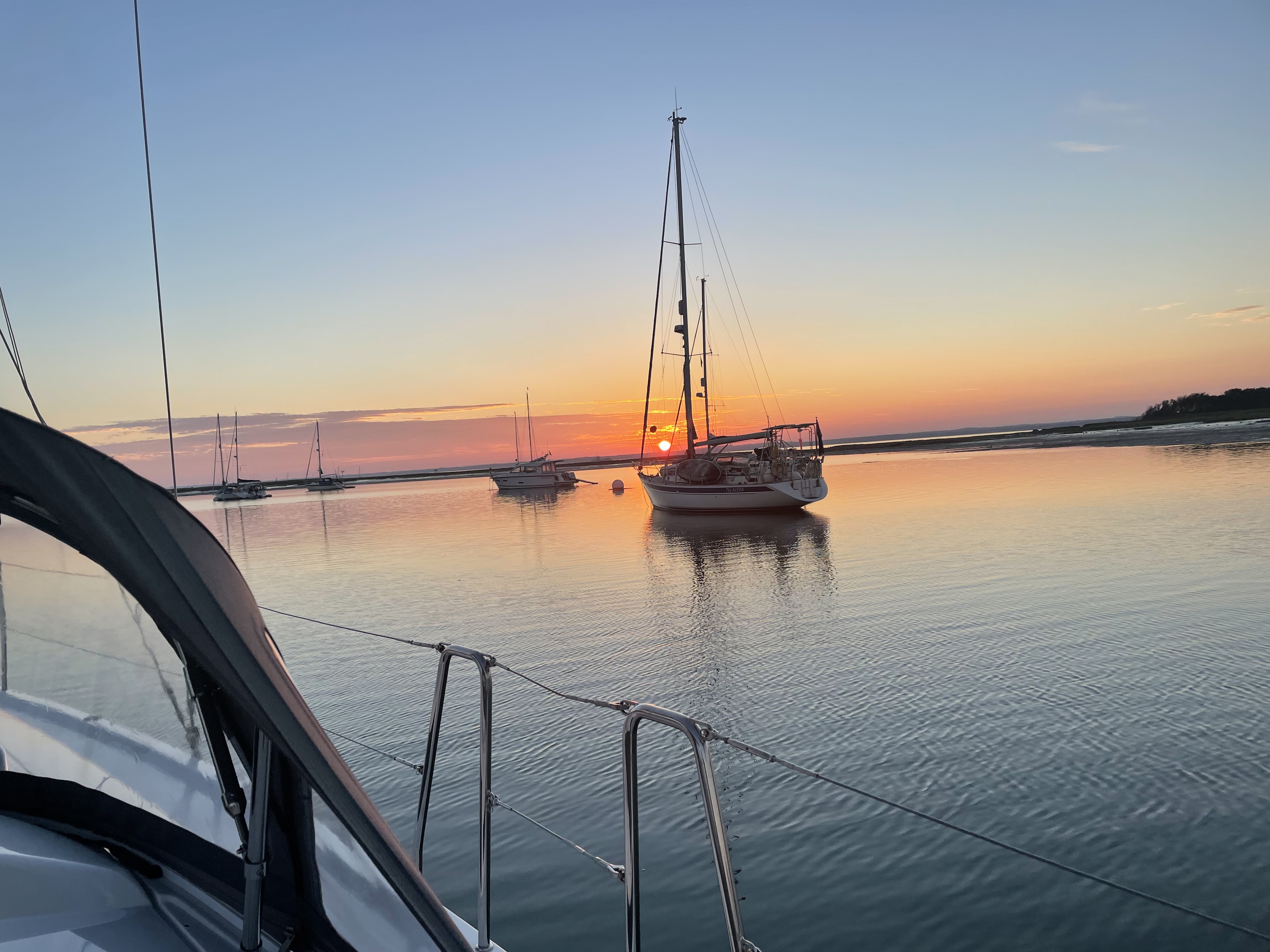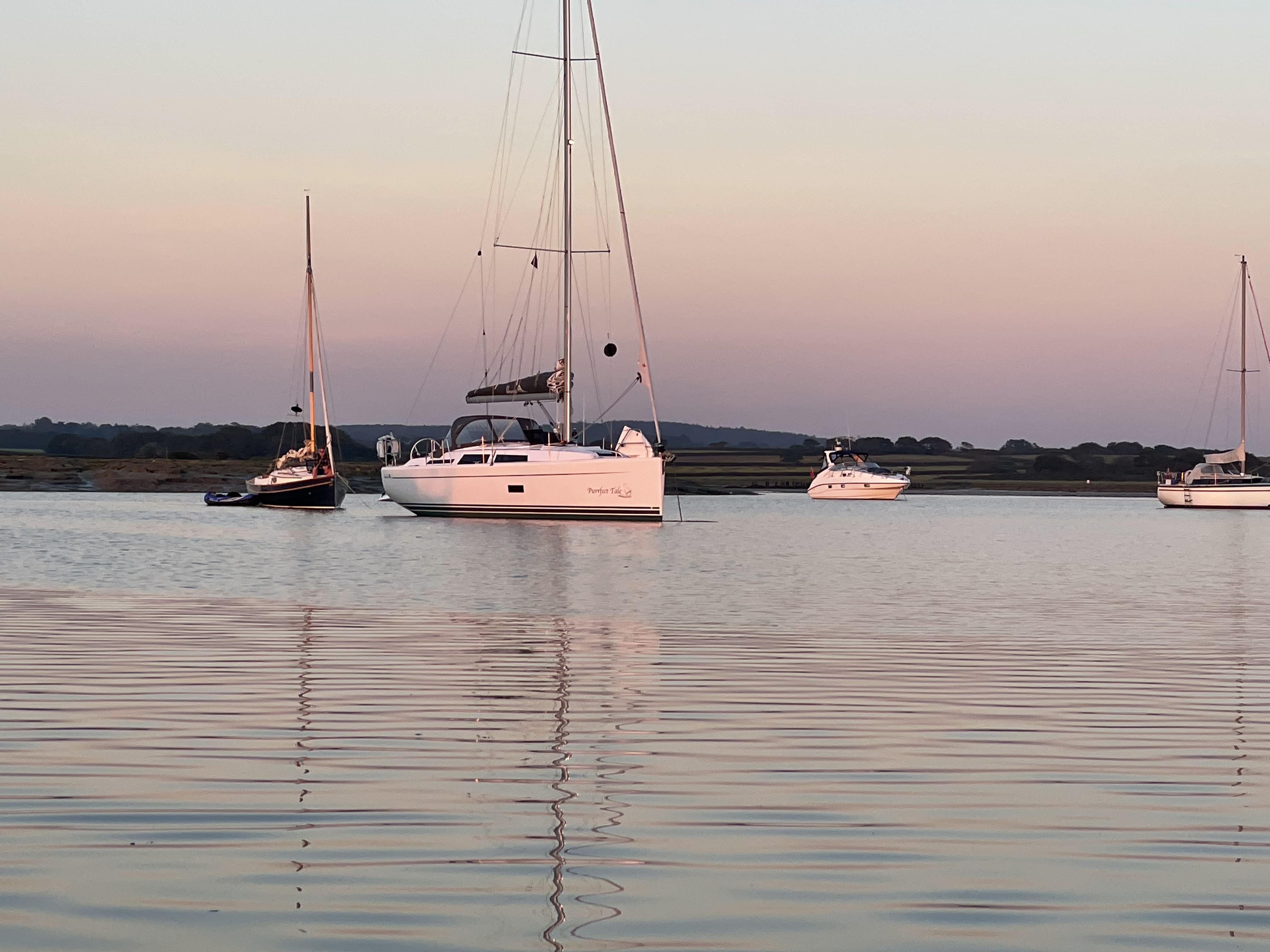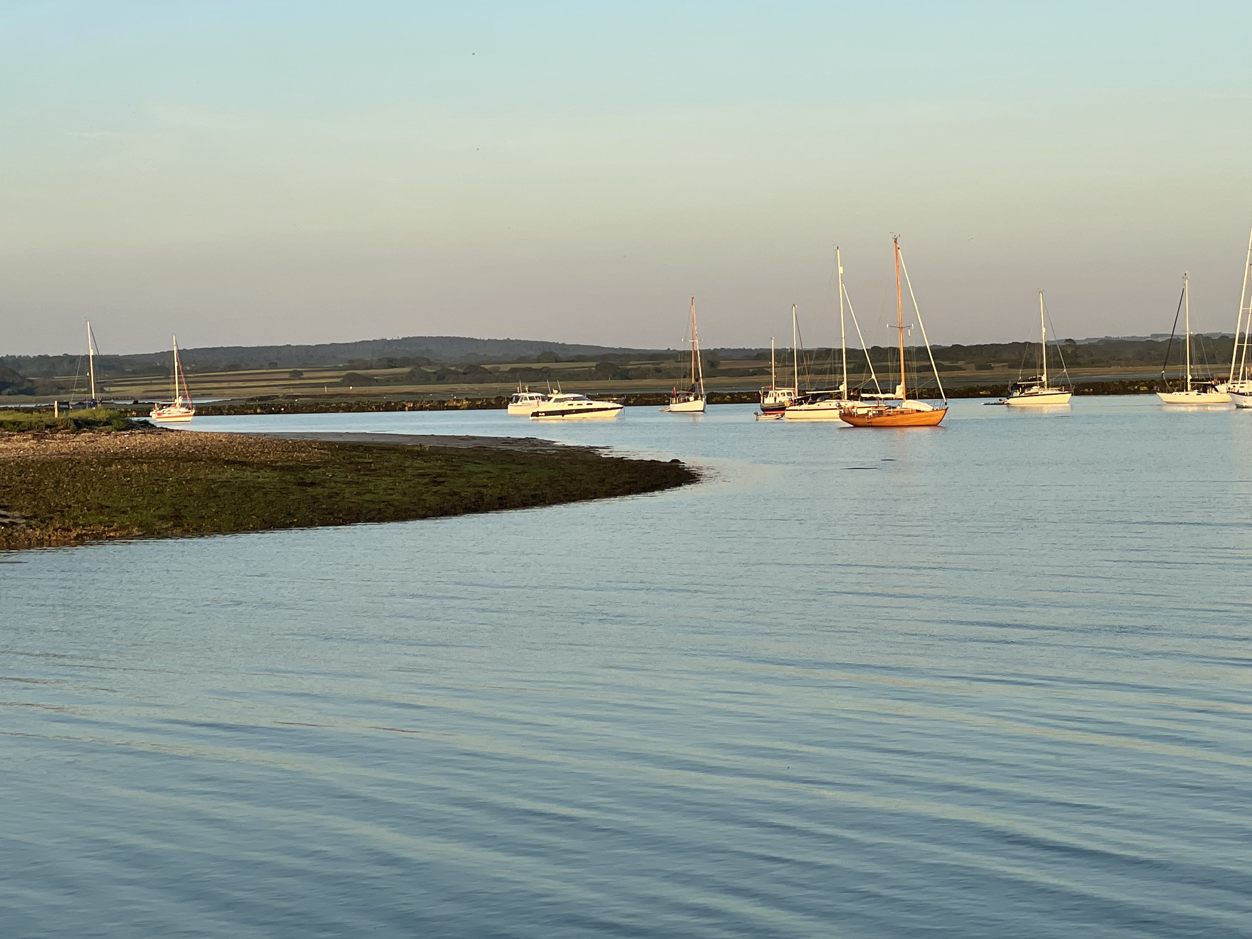 Gillian had decided to stand-down for this trip. I had broken the once per month agreement! Patricia kindly volunteered to come along. She had not ben sailing for the last 2 years since Michael had sadly passed away. It was a poignant trip for her as his ashes were scattered in his favourite anchorage of Newtown Creek. It could not have been a better day – warm and sunny albeit with little wind – hence a gentle motor down to Newtown where we arrived at what we thought would be an early arrival time, expecting plenty of buoys to be available. A bit of a shock when we arrived – absolutely packed. No buoys and we struggled to find a place to anchor. Whilst you have enough depth in Clamerkin Lake, the channel is quite narrow, hence if you put out too much chain there is the risk you swing onto the mud-bank and as the tide goes out you are left a little stranded! We dropped the anchor twice between two boats but there was limited room to swim, so we upped anchor and found a slightly quieter spot. I would like to put the choice of location down to outstanding seamanship as we ended up at low tide with .1m – 4 inches of water beneath the keel. However…… more luck than judgement.