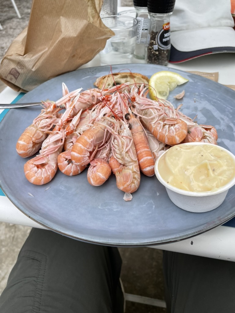 On the way back rather than go over the bridge I took the ferry from St Marine to Bénodet – I think it was Euro5. Prior to that I sat down in the cafe where I had morning coffee for lunch of langoustines.