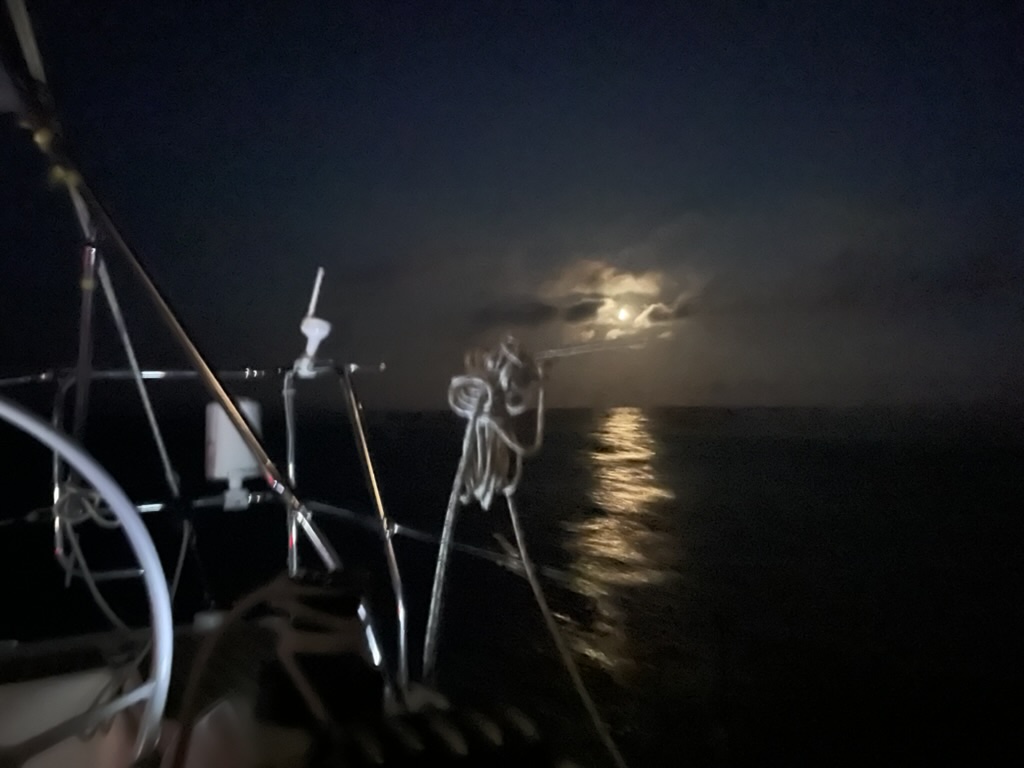 Dinner was tuna and pasta with a couple of eggs beaten in and some sweetcorn. We were both getting tired after a series of night sails and early mornings as well as an unseasonable drop in temperature for July. It therefore tasted very good at 2000hrs at night. Darkness soon fell and there were few boats around. There was one large sailing yacht to the west of us who had gone outside of Les Triagoz and were making good progress. Other than that we were alone in the dark. Not even any fishing vessels about. There were times when we could sail and others when we had to motor.