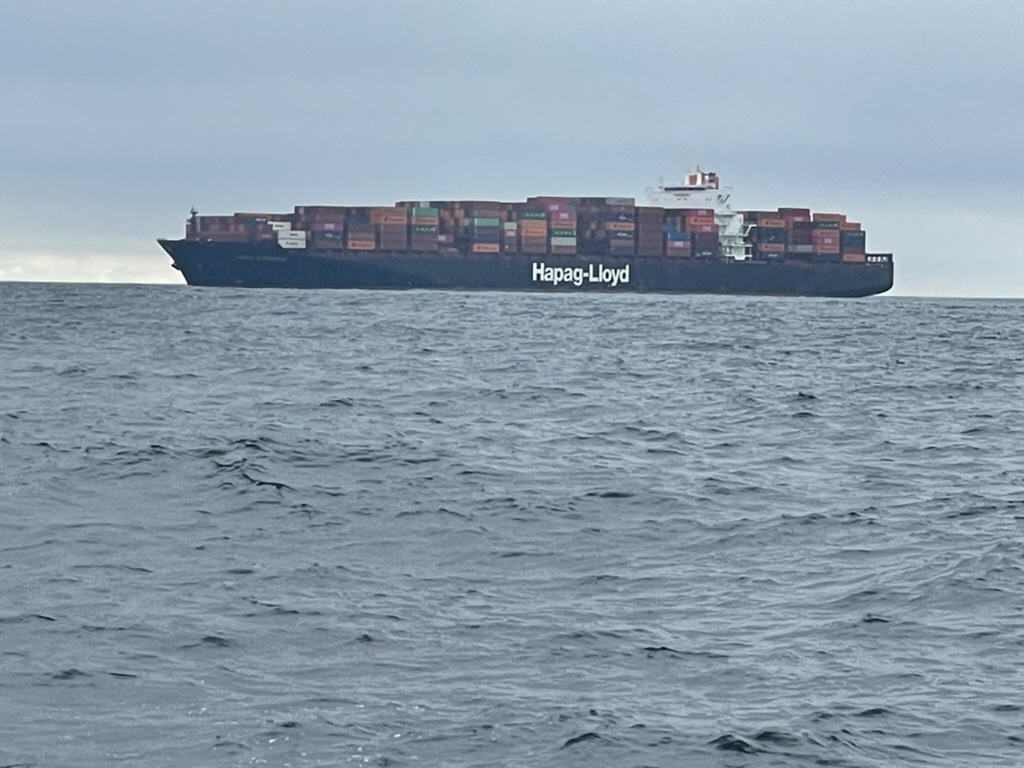 We arrived at the Needles at around 0100 and had a pleasant sail and motor sail down towards Thorne Channel and Southampton Water where we arrived about 0330. As we began to relax I spotted a lot of lights off Cowes and amongst the lights the flashing blue light of Southampton Patrol Vessel. After examining the AIS we saw there was one container ship and two cruise liners coming in ot Southampton water and one SP guiding them – shuttling back and forth. We idled in the shallow water on the west side of Thorne Channel. The ships pass very close to you but you are safe and they know where you are. Once all had gone through the SP vessel came across to us to thank us for our patience which was a nice touch.