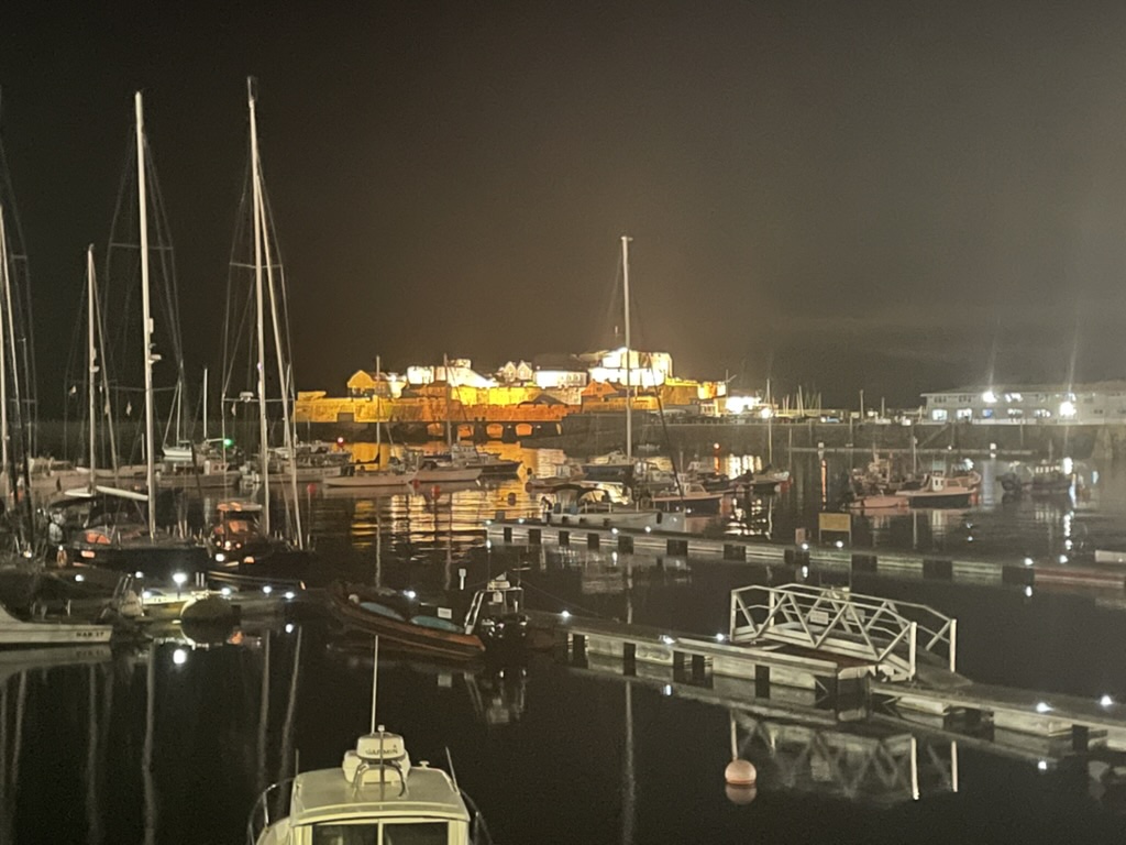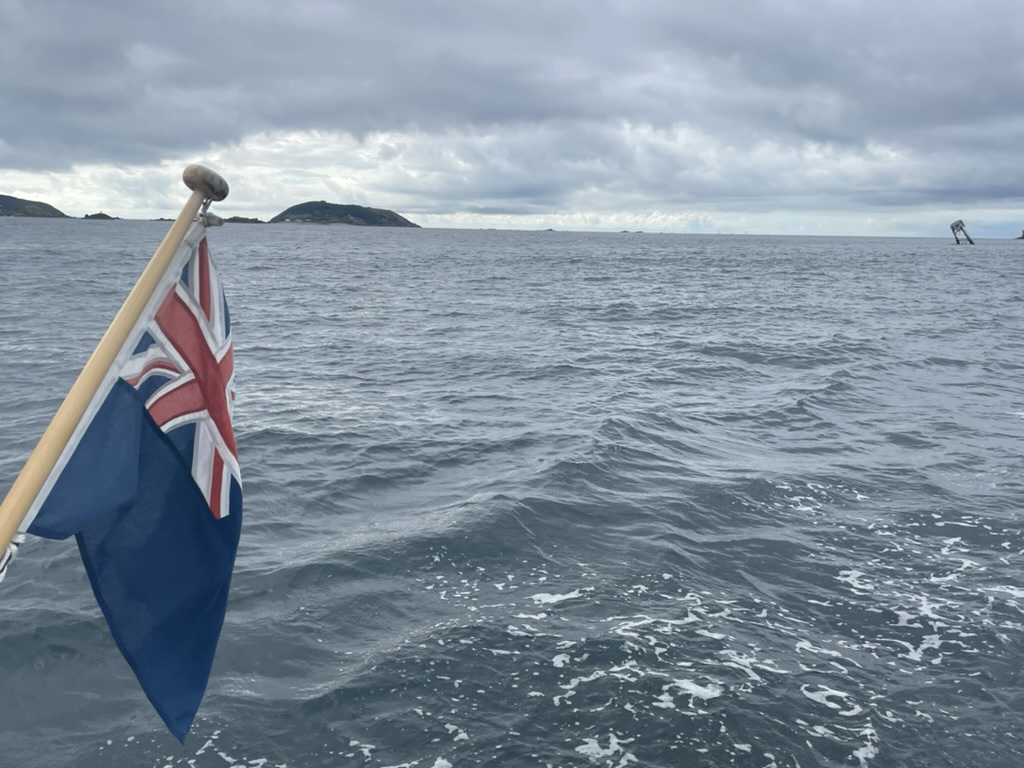 We managed to pay for our stay on Passe-Port Escales which pad for the meal last night. We were on the outside pontoons furthest in with 3 boats outside us and a huge yacht behind us. However we were not planning to leave till around 1030 when the tide was just turning in the Russel to take us up towards Alderney. Interesting Navionics automatically routed us outside the Casquets. I could see why the algorithm worked this way but that route would complicate crossing the sea lanes so we planned on the more traditional route of going North through the Alderney Race. Wind was not strong F3/4 and with the die so we were not expecting anything too rough.