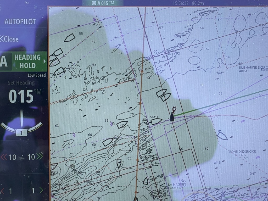 We made the northern tip of Alderney within 4 hours of leaving St Peter Port and then struck out across the Channel. It was a good sail with some motoring. The shipping lanes were very busy and we seemed to hit each at just the wrong time. I had got into the habit of looking at CPA and time to CPA. If it looked as if one of the ships would come within 1Nm or less, at 2-30 mins out I would call them on Ch 16 and ask if they were content with my course and speed. Most responded and were happy to accommodate us. We crossed both shipping lanes in daylight.