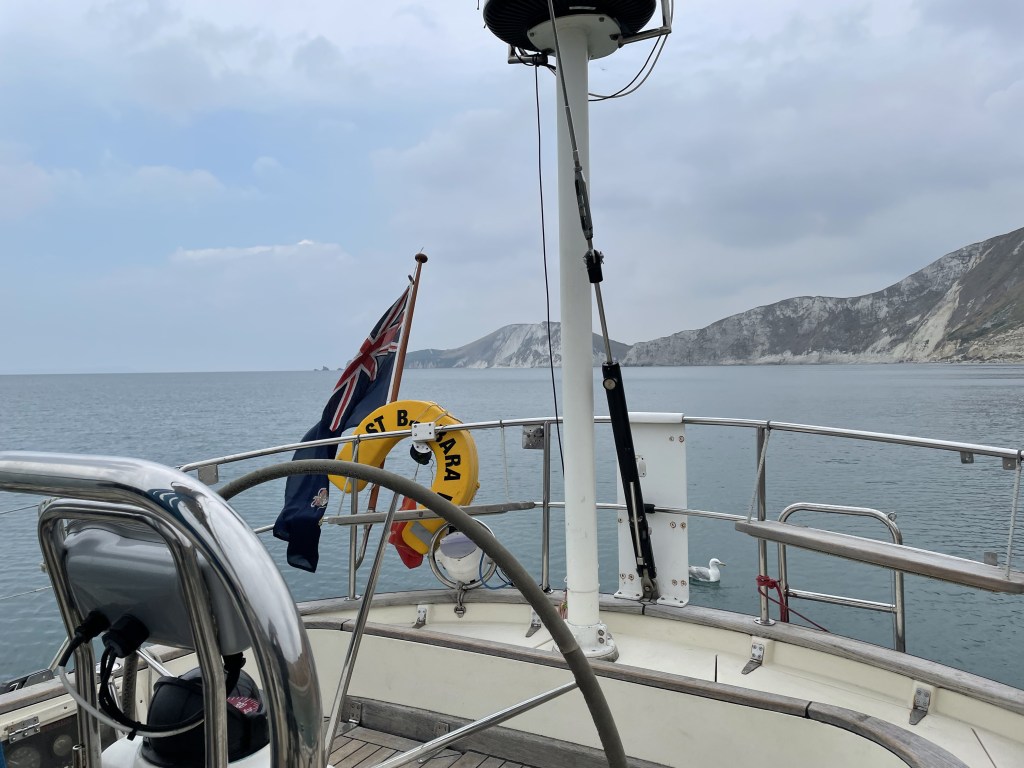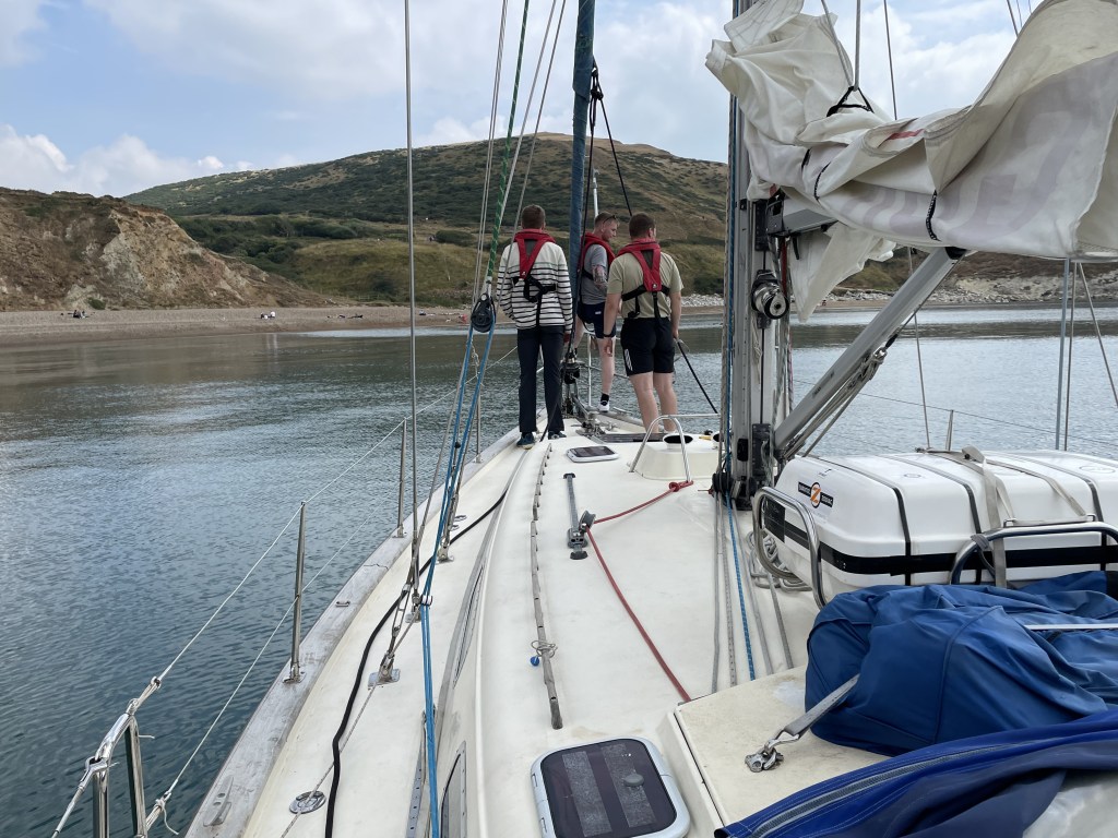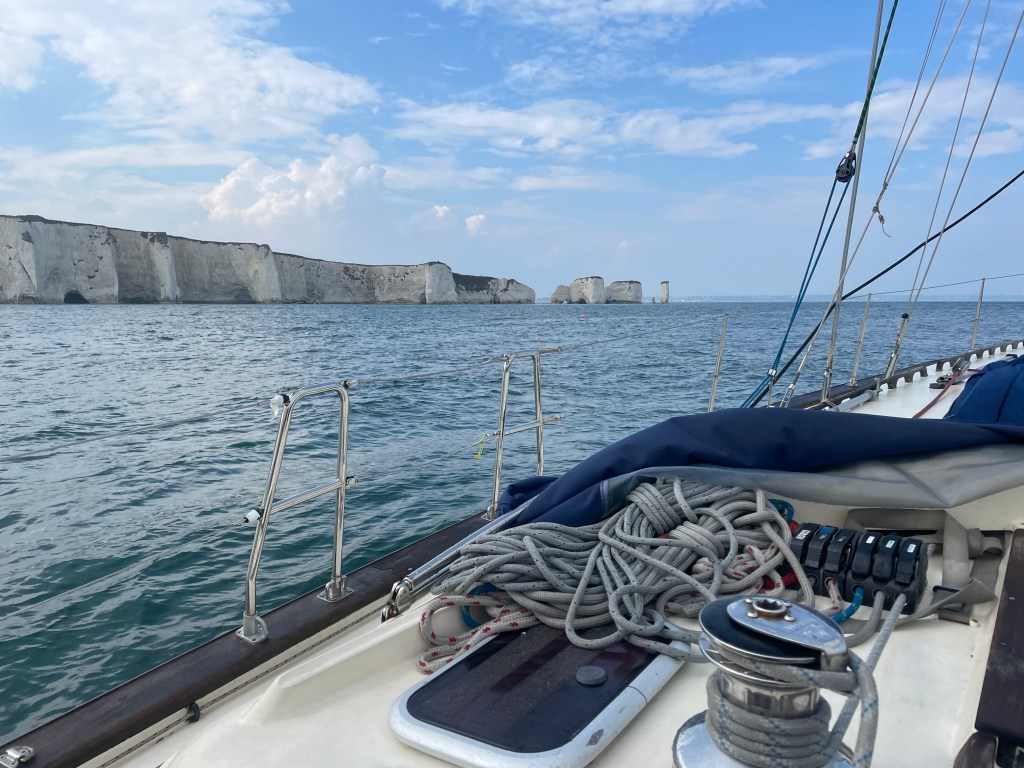 Not an early morning start which was just as well given the time they got in last night. However it was impressive that when the shout of reveille went up they were all out of their bunks. When planning the trip the intention was to anchor in Studland Bay. Once we started there was a plea to have somewhere that they could have a decent run ashore. Whilst it might be billed as an adventure training exercise, they were also recovering from what is the hardest term at Sandhurst. Simplistically Sandhurst is divided into Term 1 – teach the basic skills and drills, Term 2 – assess and Term 3 – develop. For Term 2 there are a lot of exercises in the field each being given leadership tasks and assessed on their performance. It is the highest stress term. By the end of it there is a sigh of relief that they have got through the worst of the course and can begin to look forward to commissioning. They had all been allocated their ‘cap badge’ or Regiment and their individual uniforms ordered. Hence a desire to have some downtime. To that end Studland Bay was cancelled! The alternative plan was to go into Poole Town Quay. We left with a brisk wind. With the military ranges closed we could sail along the Jurassic Coastline.
