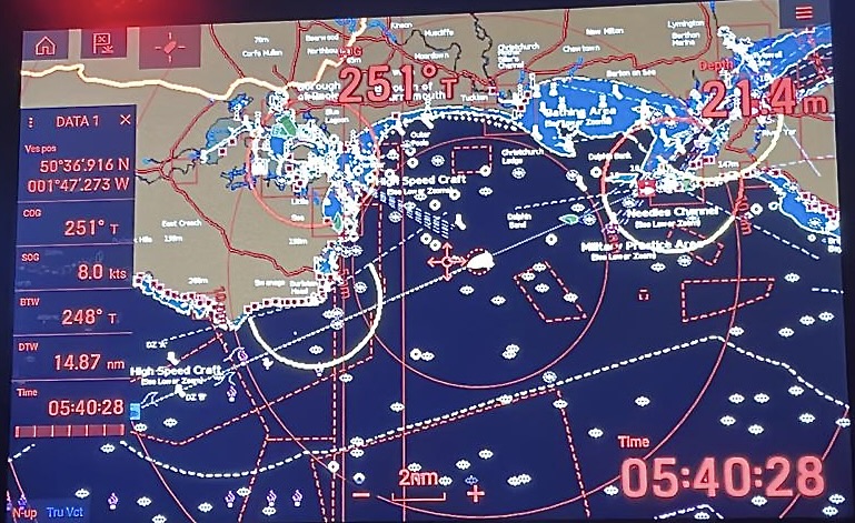 Reveille 0400. All were up and ready within 15 mins. We slipped the line from the buoy and turned to motor down the Needles Channel with no wind. It was pitch black with only one other sailing boat in our vicinity. All of the crew were wanting to get sufficient days, miles and night hours to enable them to take their day skipper’s assessment. Hence the early start did not prove as unpopular as I had expected. Although as one of them pointed out, the requirement was to be sailing during darkness – but it did not stipulate that you had to be on deck! Although a straight forward leg of the journey, it did highlight the challenge of navigating in a channel with many lights at night from cardinals, to port and starboard lights as well as special markers. Working out which was where and what was in front or behind required both concentration and good chart work.