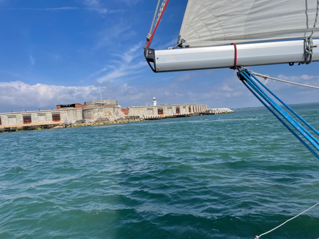 The sail back to the Needles channel was straightforward. There was a little wind to start with but that dropped off by mid-morning. We took the North channel through the Needles which takes you a couple of boat lengths off Hurst Castle. We had a SW wind which makes it a little awkward sailing down the Solent with the wind directly behind you. We sailed not quite on a dead run till after lunch which was a magnificent spaghetti carbonara – very impressed with the quality of chefing on the boat. Once lunch was over the mainsail came down and we used just the foresail all the way back to Gosport.