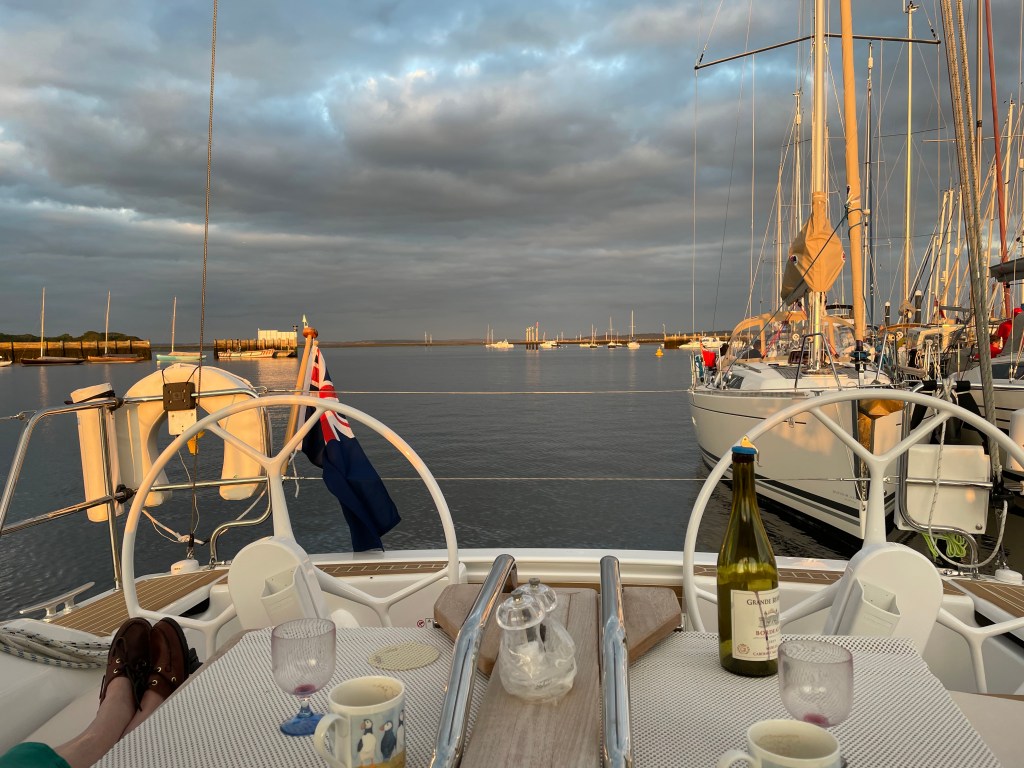 The two other boats joining us for the run to Poole arrived late in the evening – Dino Volante with Pat, Ken and Linda – followed by Karisma with Bryan and Britt on board. The Cobb BBQ was put on and pigs in blanket were shared around. This was followed by a healthy meal of burgher, sausage, baked beans and new potatoes. Diet and healthy meals out of the window whilst sailing as well as dry weekdays!