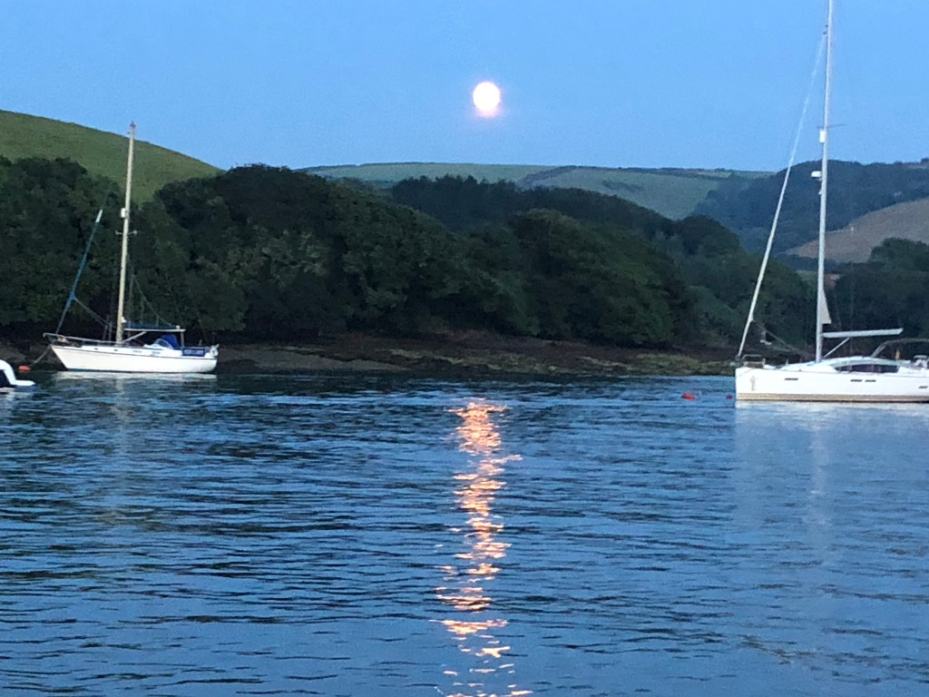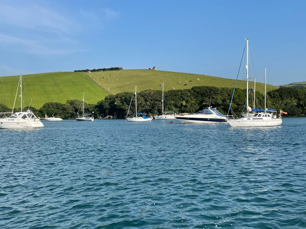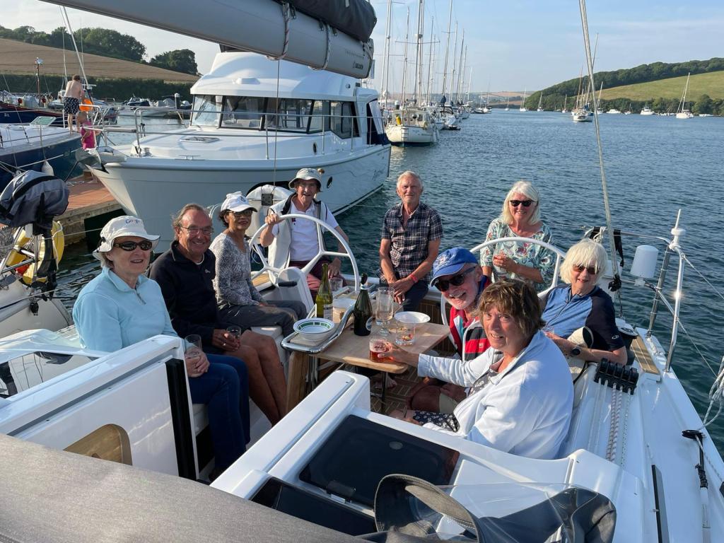 Having got into Salcombe there was a man of boots, canoes, inflatables, taxis and yachts wither moored or moving about. Whilst avoiding collisions a very calm Harbour Master boat came alongside to offer help and to make sure we knew where we were going – which we did not! We finally understood that we would be berthed in the Bag – 2nd left down the channel – alongside a pontoon. We were greatly helped by Bryan and Britt frantically waving at us and helping to come alongside Karisma. That evening we hosted drinks on board Purrfect Tale and had an extremely social and enjoyable evening’s banter.