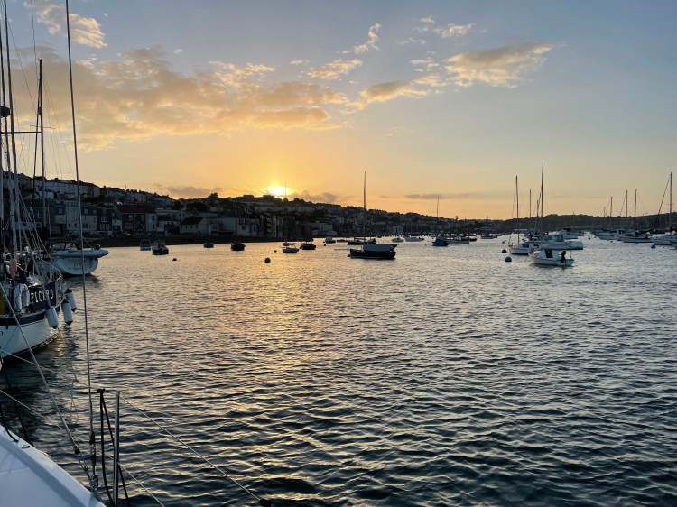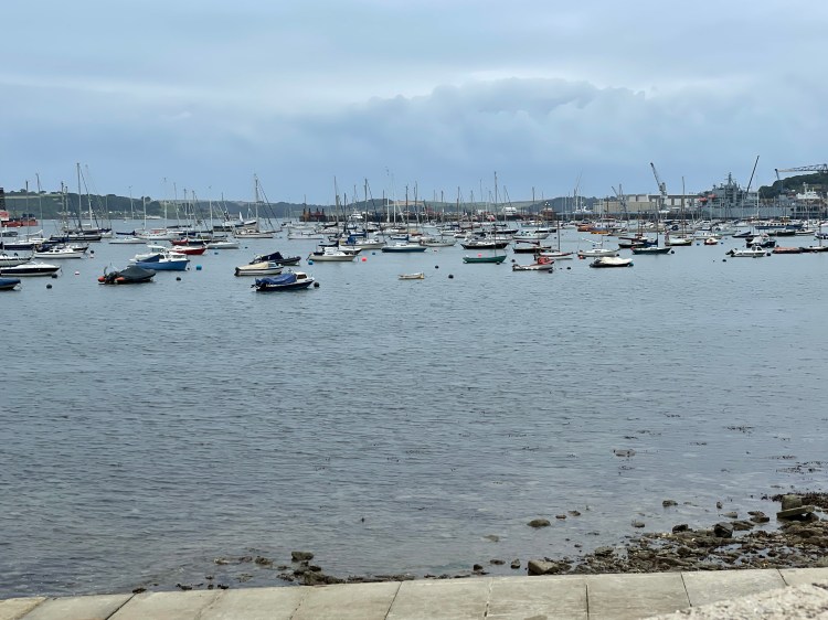 Straight after the lunch Pat and Linda headed back by car to Hamble to get ready for Cowes week. The remainder of us returned to Falmouth Havan to plan what we would be doing next. Storm Evert was due through that night with winds forecast to be 40kts+ hence all had decided to stay another day at least. During the late afternoon a small number of boats arrived from the Isles of Scilly to avoid the worst of the weather. Next to us was Voyager – Halberg Rassy 38 – which had been rebuilt by Marty and Chris who had with them their young son. They had been anchored near CADOHA (Carly, Dominic and Hank) in the Isles of Scilly but decided to make a run for it. The following morning we read the blog from CADOHA which had a very uncomfortable life and described how some had not been as fortunate they them with the need for the RNLI and and Air Rescue to be deployed to pluck people from the deck of a boat which had broken lose. It was not too bad in Falmouth but was nevertheless a very noisy and windy night. Got up a couple of times to check shore lines and fenders. Brian on Karisma who was on our inside having taken out his hearing aids slept like a babe and emerged the next morning looking very refreshed unlike the rest of us.