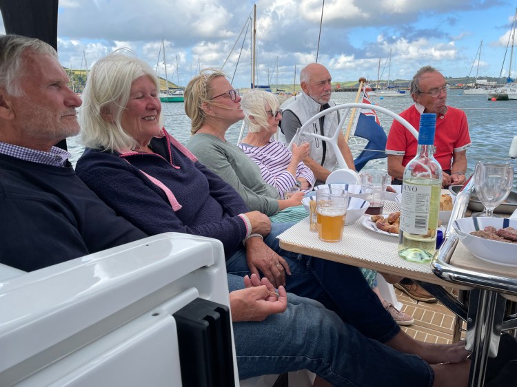 Immediately we had to start preparing for the last pontoon party of the trip. We had assembled a drinks cabinet of Sipsmith Gin, Plymouth Navy Strength Gin, Red and White Wine, zero alcohol beer, and soft drinks. On the food side, a variety of sausages to be done in the oven, gigantic pork pies, burghers to be cut up, crisps and dips. We did not have enough glasses so it was a bring your own glass type party. At its height we had 12 in the cockpit. A really nice evening and a fitting end to the formal part of the summer cruise.