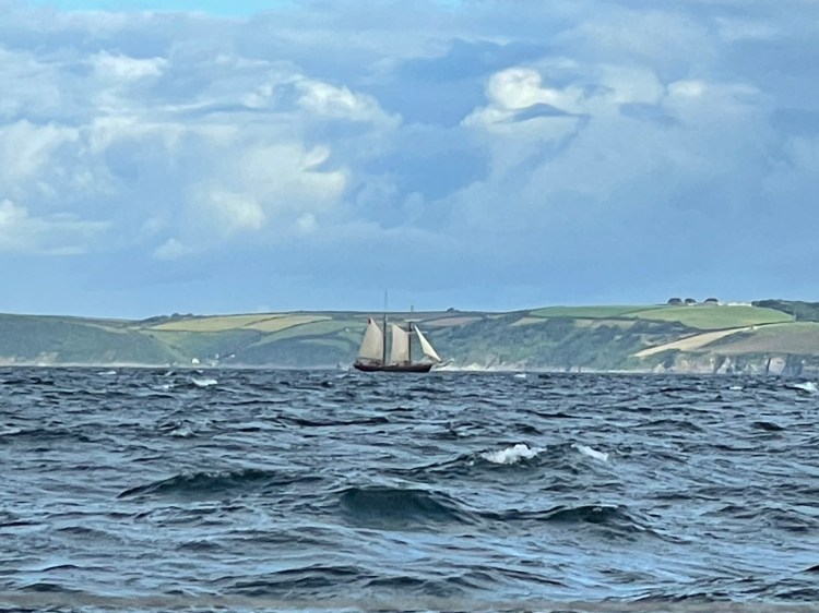 But as the morning wore on and probably we became more used to the strong winds we started to sail in Saint Austell’s Bay. We did take a reef in but kept a full headsail up. I was surprised (and received) that she handled very well and was certainly a confidence giver. We had a great deal of fun and it was difficult to get Mark off the helm. This was the sailing he had come out for. I was relegated to making bacon sandwiches to keep us going!