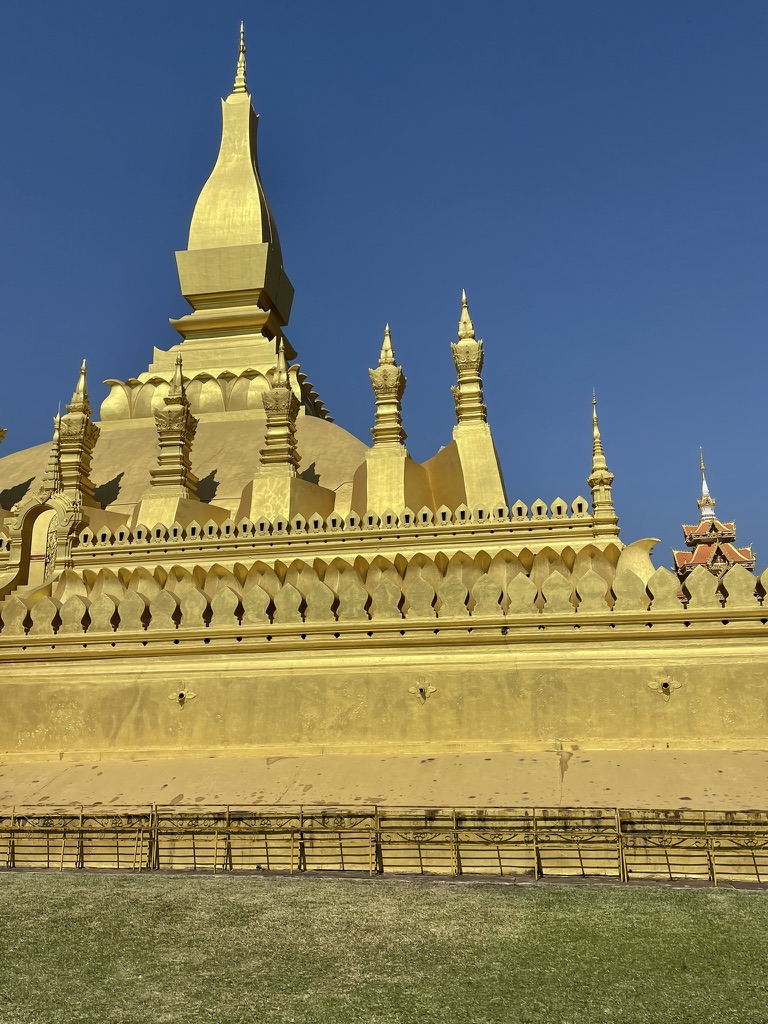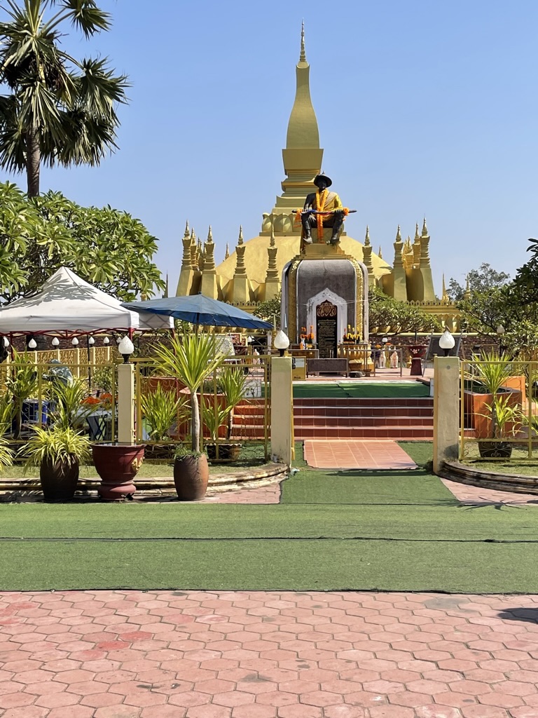 From there we traveled to the Golden Pha That Luang Stupa – one of the highlights of Vientiane. Inside the huge gold painted stupa is reportedly a small inner one that contains the collar bone or breast bone of the Buddha that was brought here in 3rd Century BC. The Stupa had been destroyed many times and latterly in 1827. The French rebuilt in 1900 and since then it has had a number of modifications. It is a place of great significance to Lao people.