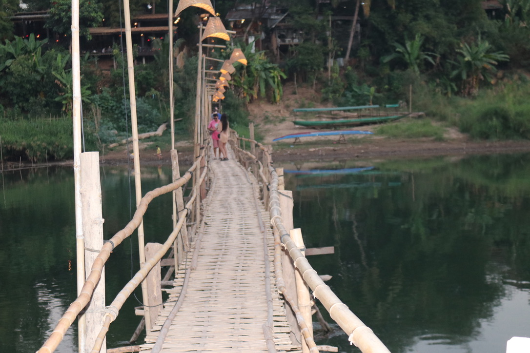 Late afternoon we went for a walk around the town, first stopping off at a coffee shop that roasted its own coffee beans from south of the country. Then down to the ‘bamboo bridge’ across the Khan River. This is only viable in the dry season and it is rebuilt each year. On the other side we had grabbed a table overlooking the bridge as subset occurred – slowly sipping a cocktail and a beer. Back across the bridge we wandered into town. I drew out 1m Kip assuming this would last me till the end of the trip – that was until we came across a shop selling Buddha’s. Gillian wanted to get a Tuesday and a Wednesday Buddha – there is a different one for each day of the week – but two for Wednesday. My negotiating skills departed me and I ended up paying far more than I should have – but still not that much. It is difficult to resent giving money to the people of a country which is so poor.