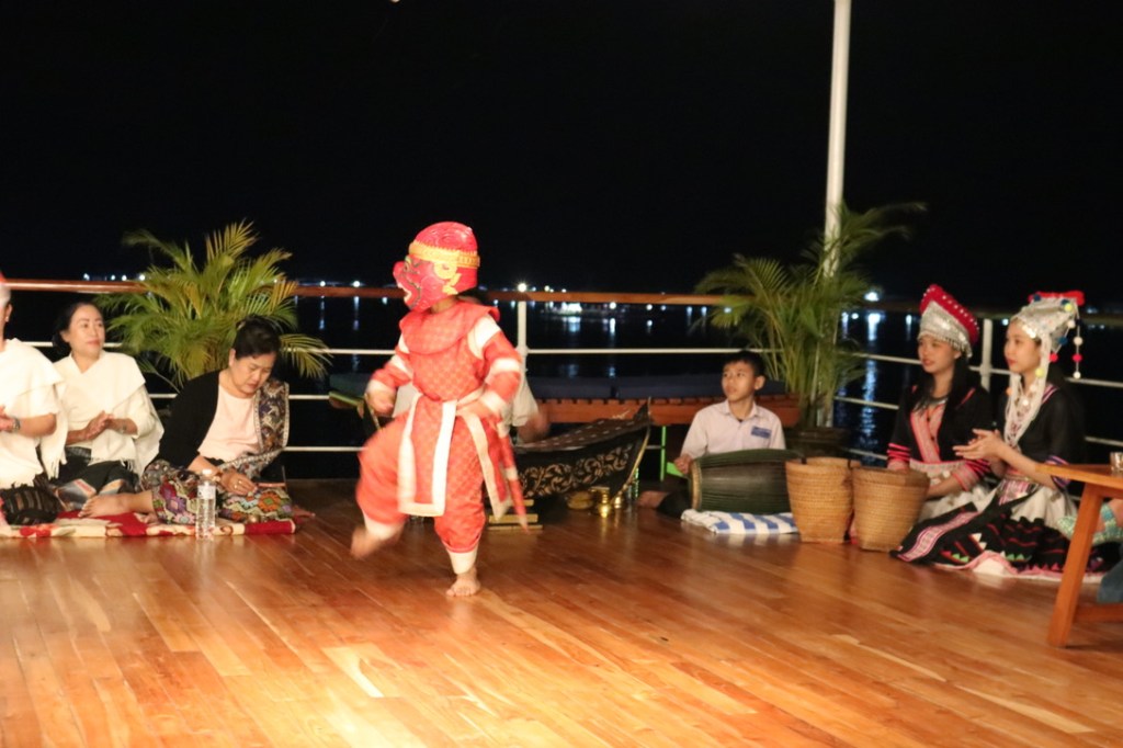 In the evening after cocktails we were entertained by Lao Traditional dances in the Baci Ceremony. This is common place in Laos and is undertaken when there is something to celebrate – from birth to a family member returning home. A man and young boy played a Ra Nat and a drum respectively. The women sang and used miniature cymbals and the girls danced in traditional costumes. The very young boys danced Khon – with elaborate masks that covered their entire face and body suites of monkey or dragons.