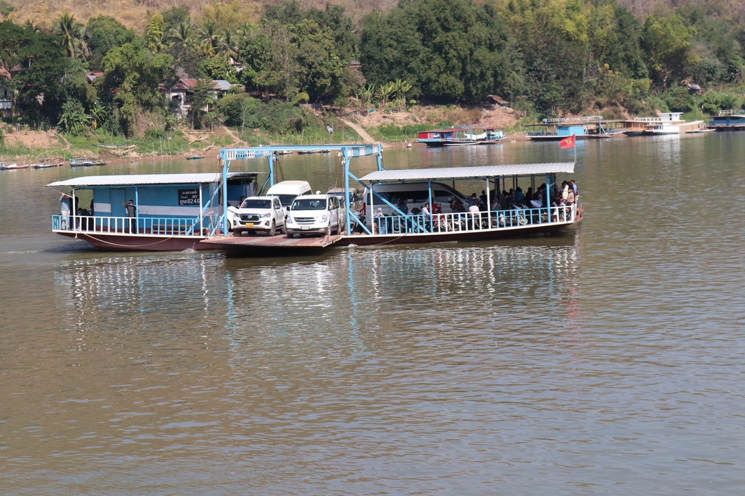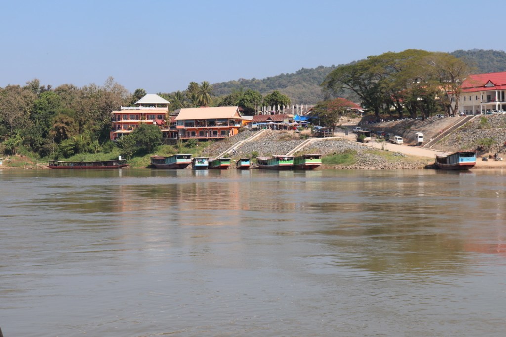 We were ferried to the border at Friendship Bridge No 4 where we were stamped out of Thailand. Forms and passports were handed in at one window with 20 Baht and a photograph and you went to another window to collect the stamped passports to recognise you had now left Thailand. Through a customs post to the Laos checkpoint. Fortunately I had changed money from $ to Laos currency and had got a feel for the main issue which was only pristine $ notes would be accepted – any mark, crease, ink stain and they were rejected. I managed to find 2 x $20 bill for Gillian but all other $ bills were rejected. Fortunately Gillian had spotted a sign that stated you could pay in Baht or local currency – so all the money I had changed went on pay my visa 69,000 Kip. But at last we were through and onto the bus. I did manage to change some more Baht into Kip so was not entirely penniless. Once across the bridge we met the boat that had travelled across to meet us. The whole process took about 1.5hrs. We then got underway down the Mekong.