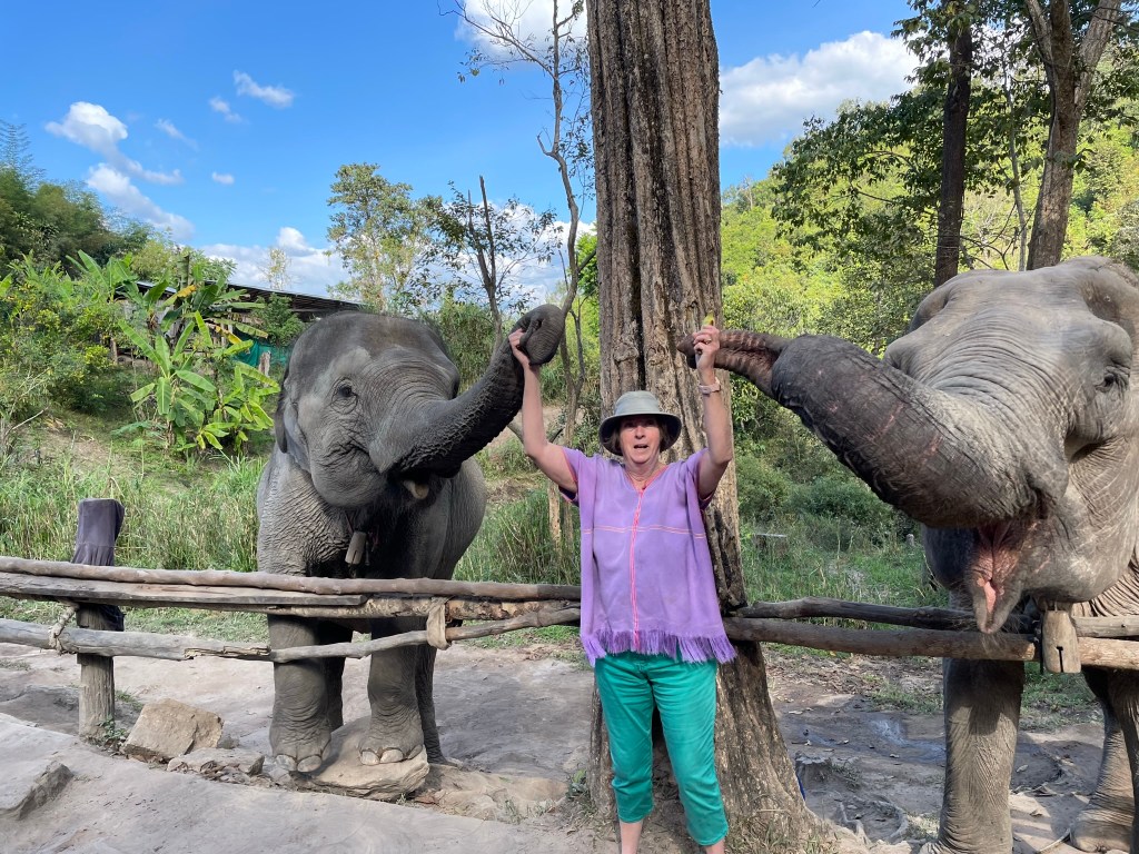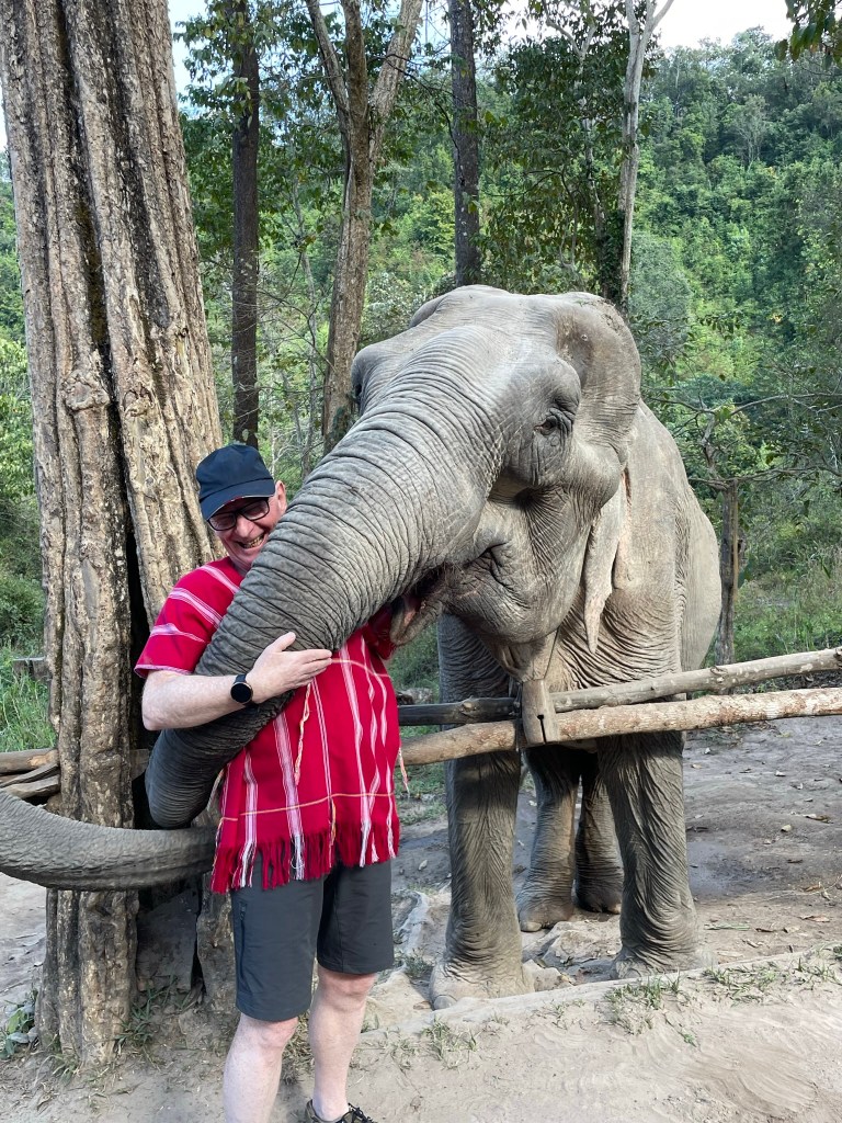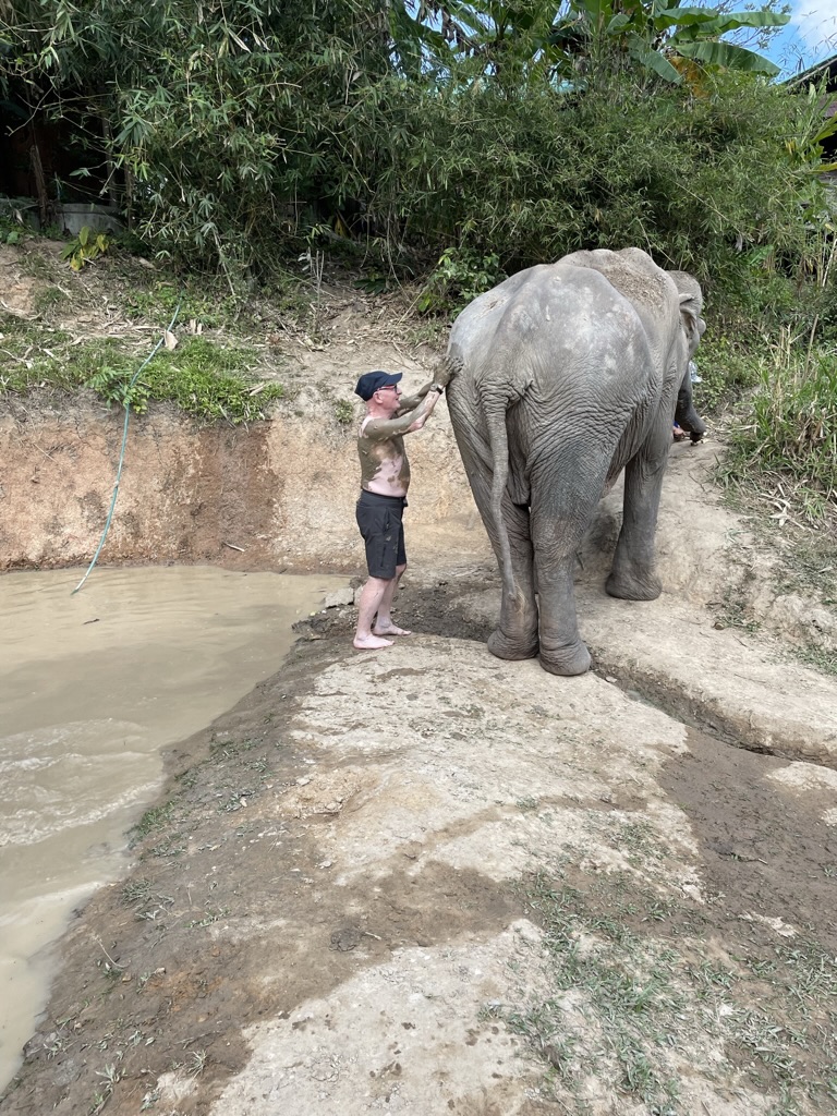 Two of the couples were in their 20s and were on a 6-8 month break and there was also a Portuguese couple. The sanctuary was aound 60kms away and high up in the hills. We were met by ‘Robert’, a very enthusiastic guide. The Sanctuary was next to a Karen Hill Tribe village. THis tribe is the largest ethnic minority group in Thailand. Historically they orignated from Tibet, migrating through Myanmar into Northern Thialnd. The houses were simply built on stilts and open sided. Many did have satellite dishes! Two choices Chinese channels – cheap but controlled or Thailand – more expenseve but more western. Within the Sanctuary there were 5 elephants – all female. After lunch in a ‘long house’ we collected bananas to feed each of the elephants. Robert showed us how to stand right next to the elephant hiding a banana behind our back. The elephant would then put their trunk around the front of the body and ‘sniff’ out the banana from behind. A little disconcerting at first time but they were so gentle that we soon become very relaxed stroking the trunk as they felt around for the banana. We then followed the elephants down to the mud bath and got into the water with them, covering them in mud stripped down to the waist. It would have been a little helpful if we had been warned about this before going – neither Gillian nor myself had any swimming costumes – Gillian stayed on the side and I decided I could manage to travel back slightly ‘damp’! Once covered in mud – as well as ourselves – it was then a short walk to the river where again we got into the water with the elephants who laid down so we could wash off the mud. They were clearly used to having people around them and even played with us by squirting water at us!