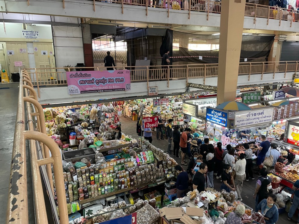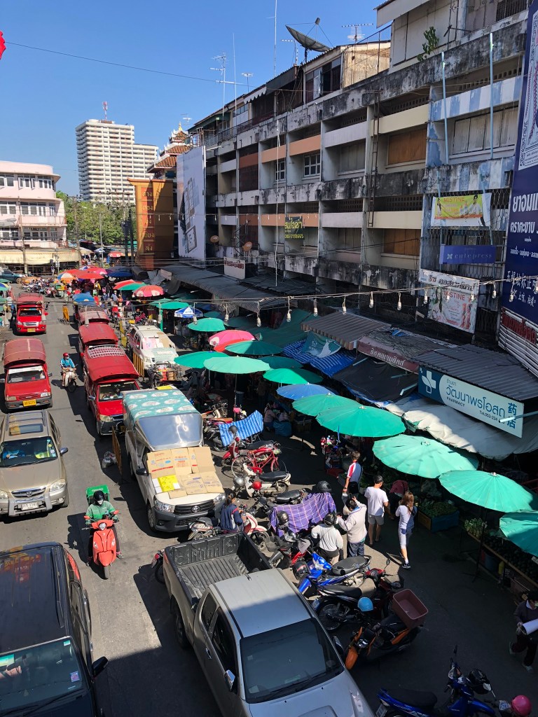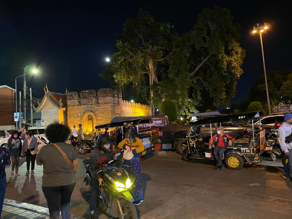Got to Tamarind Hotel at 0930ish. We were picked up by Amy – definitely not how you spell her name but we found many of the Thai adopted a ‘western’ name to make it easier for people to say and remember. The room was not ready so we went on a bit of a route march around Chiang Mai. Through the Eastern city gate (Thapei Gate) and down to the markets. Amazing place – huge markets where you could buy just about anything from flowers to clothes to live frogs.