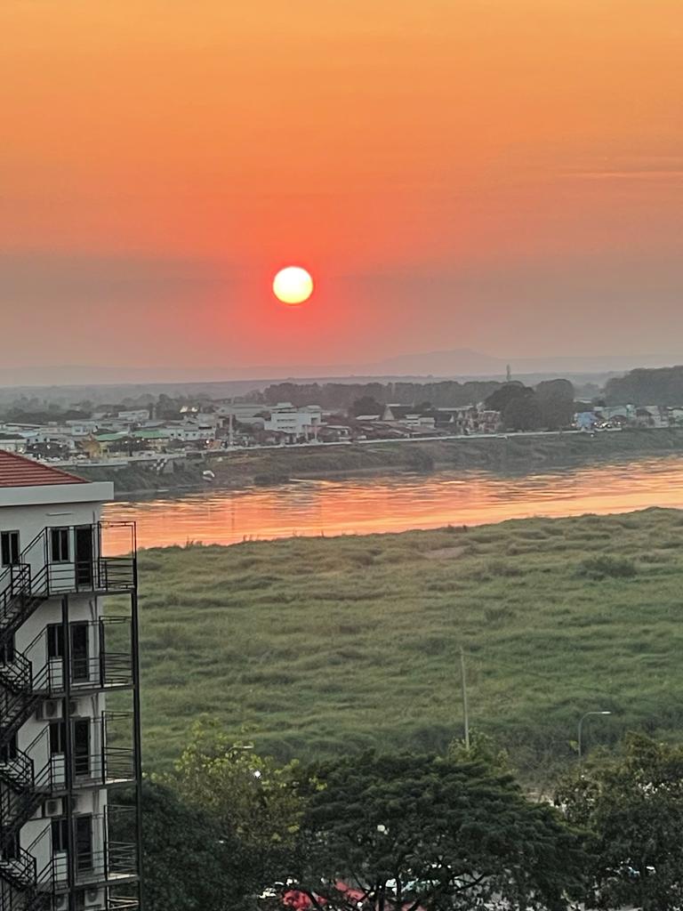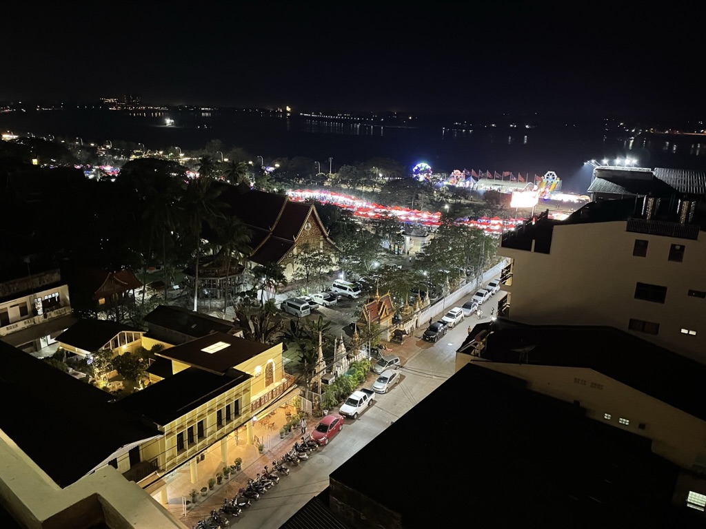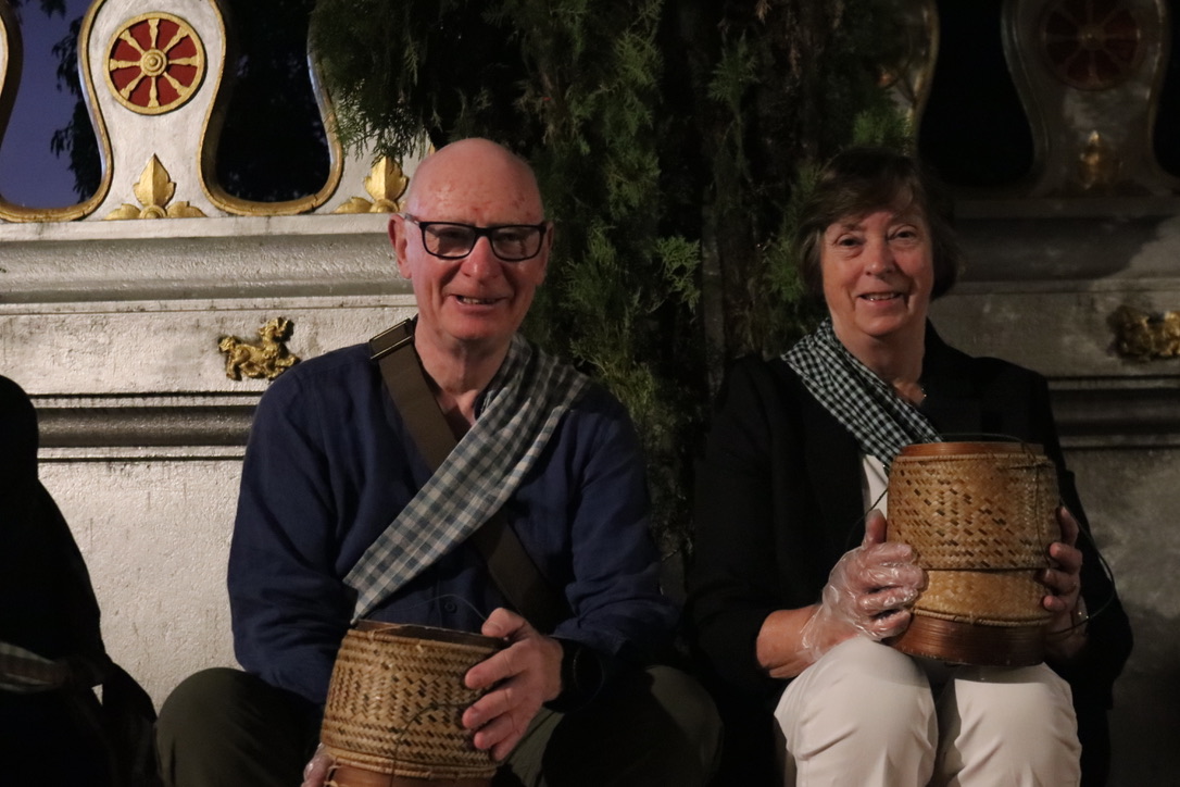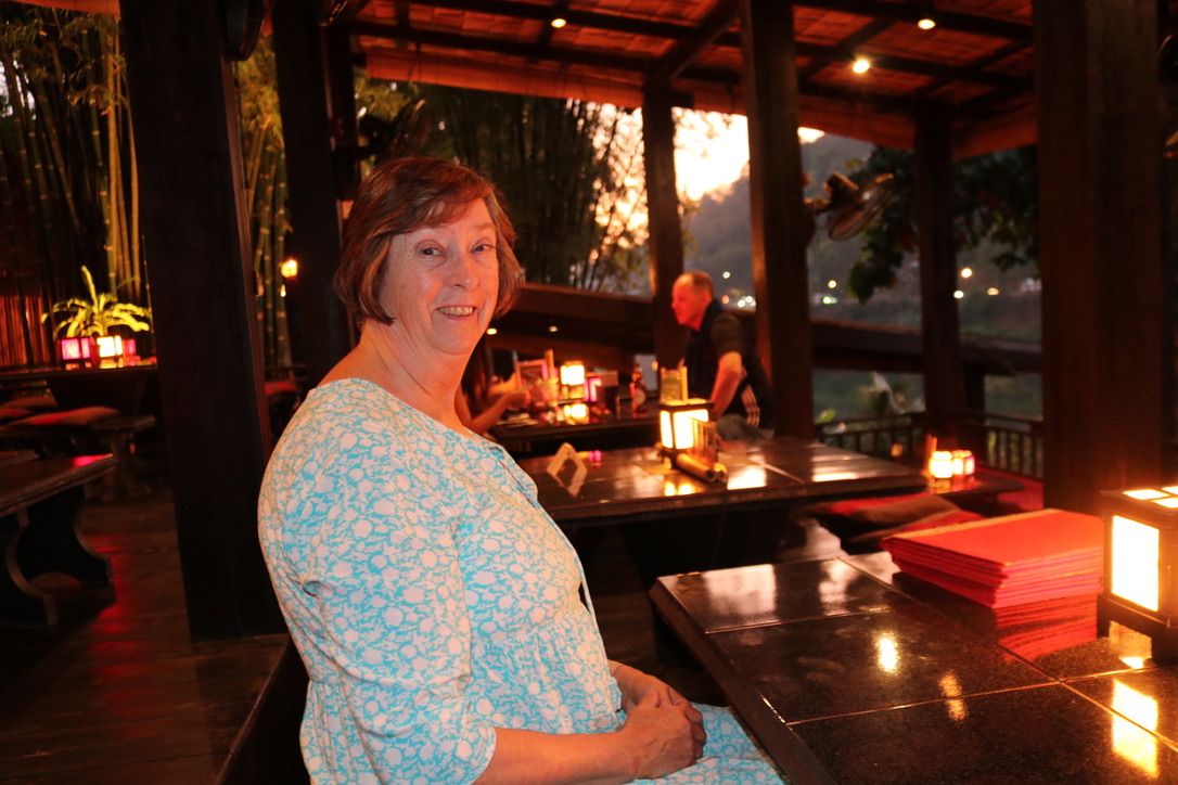 At 1400 we arrived at an unknown location, 100kms from Vientiane. Waiting there for us was a coach and it was finally time time say goodbye to the Mekong River. It has been a fabulous trip. The bus ride took a further 2 hours to get to Stay Sure Hotel in the centre of Vientiane. Suitcses had all been taken care of from Champa Pandaw to the hotel room. We had a bit of a lazy afternoon before cocktails at the Sky Bar. Pre-dinner drinks and canapés were lovely – overlooking the river across to Thailand and watching the sun go down over the city. We sat next to Mel and Liz for dinner – both from California. We had not had chance to chat with them much on the boat. Mel drew during the trip and Liz spent a lot of time on her computer. They both were fascinating individuals. Liz was an accomplished author with books printed by MiT on the impact on social life of technology. They had also travelled extensively including to Armenia and Azerbaijan. Mel was in the entertainments industry and organised major pyrotechnics and laser displays for extraordinary large events – including Frank Sinatra birthday party!