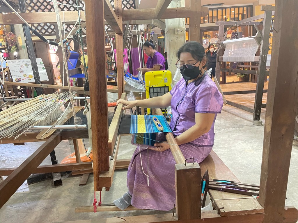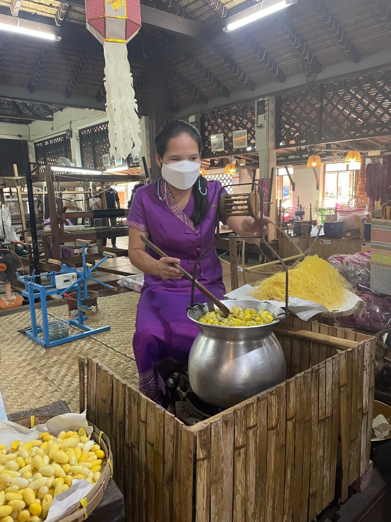 We then had a break from temple watching and were dropped off at the market we had visited the previous day. The more interesting tour was around the local craft factories/shops just before lunch. The first was silk weaving. A short talk covering the silk worm and the differences between China (White) and Thailand (Yellow) cocoon threads. The weaving was very manual in nature – no automation. Having completed the tour we then walked around the shop, followed by a very determined sales lady. The silken dresses, shirts, coats were intricate and beautifully made. Despite trying to persuade Gillian to buy a totally inappropriate short red silk dress we finally opted for a green table covering – Gillian’s colour according to her Buddha characteristic. The Silver Craft shop which followed was not quite as interesting and clearly targeted at tourists that might have more disposable income than us!