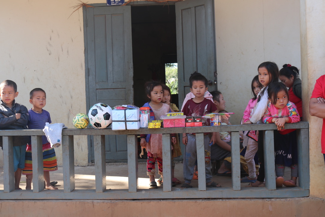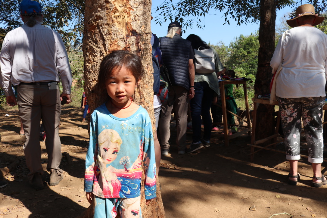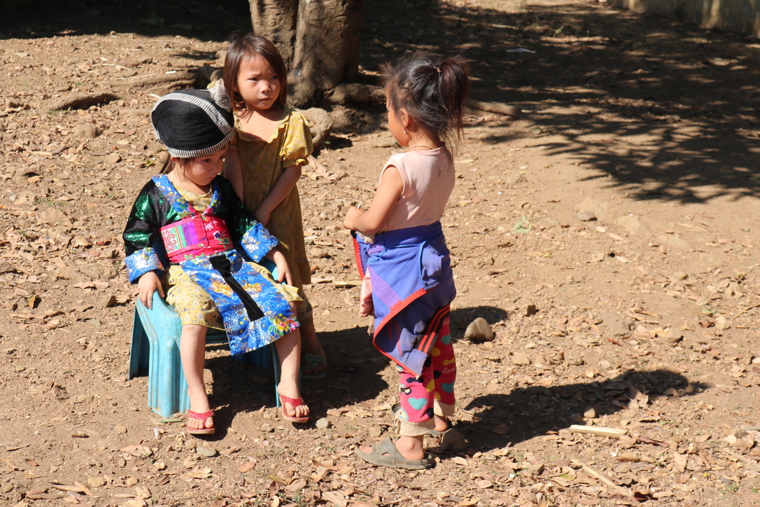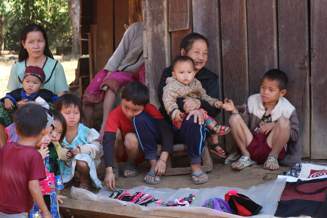 The village of Ban Ba San was a Hmong village – people originally from China who had migrated south. We were clearly expected with a group children ready to meet us as we docked. After a short walk we arrived at the schoolhouse. As previously mentioned we had all contributed to buying various items for the schools and this was the first one where we were able to present our ‘presents’ – footballs, skipping ropes, writing books etc. It was a Saturday but the teacher was around to accept the gifts. As we walked through the village there were small stands/tables with various items for sales. We all felt a bit of an obligation to buy something – to put money back into the community. It was actually fun chatting with the women who were selling and we did end up buying some little bags, a scarf and a fabric elephant. They were not expensive and it was clear that they appreciated the contributions. One of the women we met had just qualified as a teacher. She had to pay for her education and having finally qualified discovered that there was no quota for her to be employed. Further into the village we came across another table selling goods with one of the men playing a traditional musical instrument and one of the children in a wheelchair with what looked like cerebral palsy. It was the first time we had seen a disabled child in Laos. It was clear he was much loved and you could see that he wanted to interact with the visitors. It was both lovely to see but also a little heartbreaking to wonder what his life would be in the future.