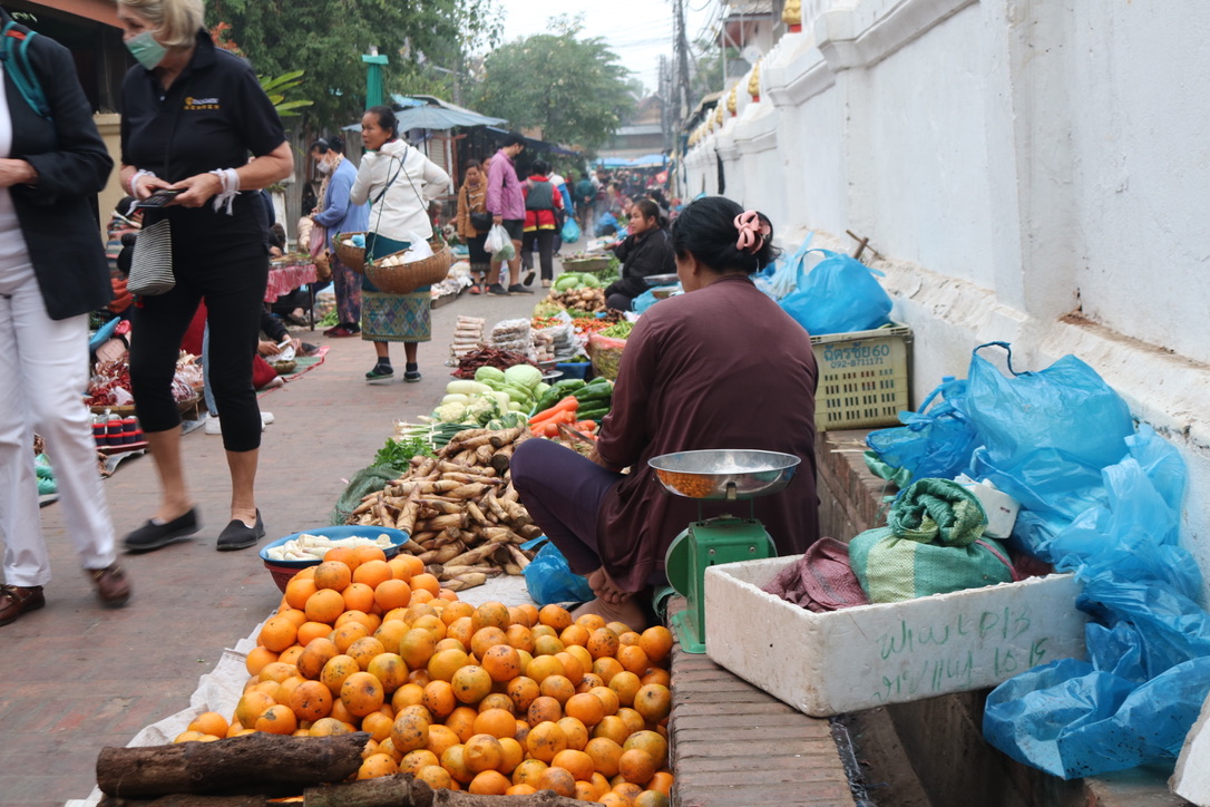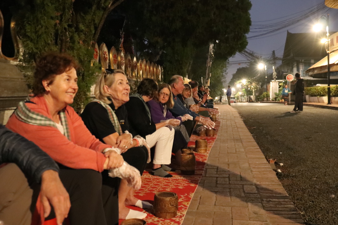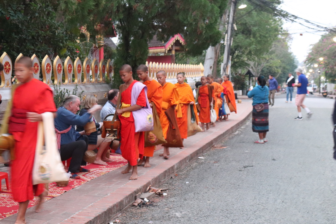 An early start – up at 0500 for tea and croissant in the salon lounge before walking into town for the Alms Giving ceremony. Each morning in Luang Prabang the monks from the different temples walk though the town collecting food from people by the road. Vieng had arranged for carpets, low stools and a basket of sticky rice for each of us to contribute to the monks food supply. We made little balls of sticky rice and as they passed each of us we dropped them into their container taking care not to touch. A simple ceremony that has been ongoing for many years but probably most of the food is now provided by tourists. As we made our way to the morning market after the ceremony we came across very young children – 7,8,9 – with plastics bags which the monks had given some of their food to the boys to feed their families.