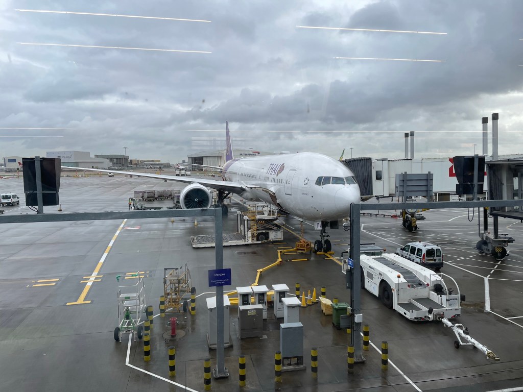 Early start leaving the house at 0630 and after an uneventful drive arrived at Heathrow. Check in queue well organised and relieved to see our bags were under 20kg. We had chosen our seats well near the back of Thai plane in middle aisle. Flight was around 11 hours and passed quickly. 3 meals and one film and we had arrived.