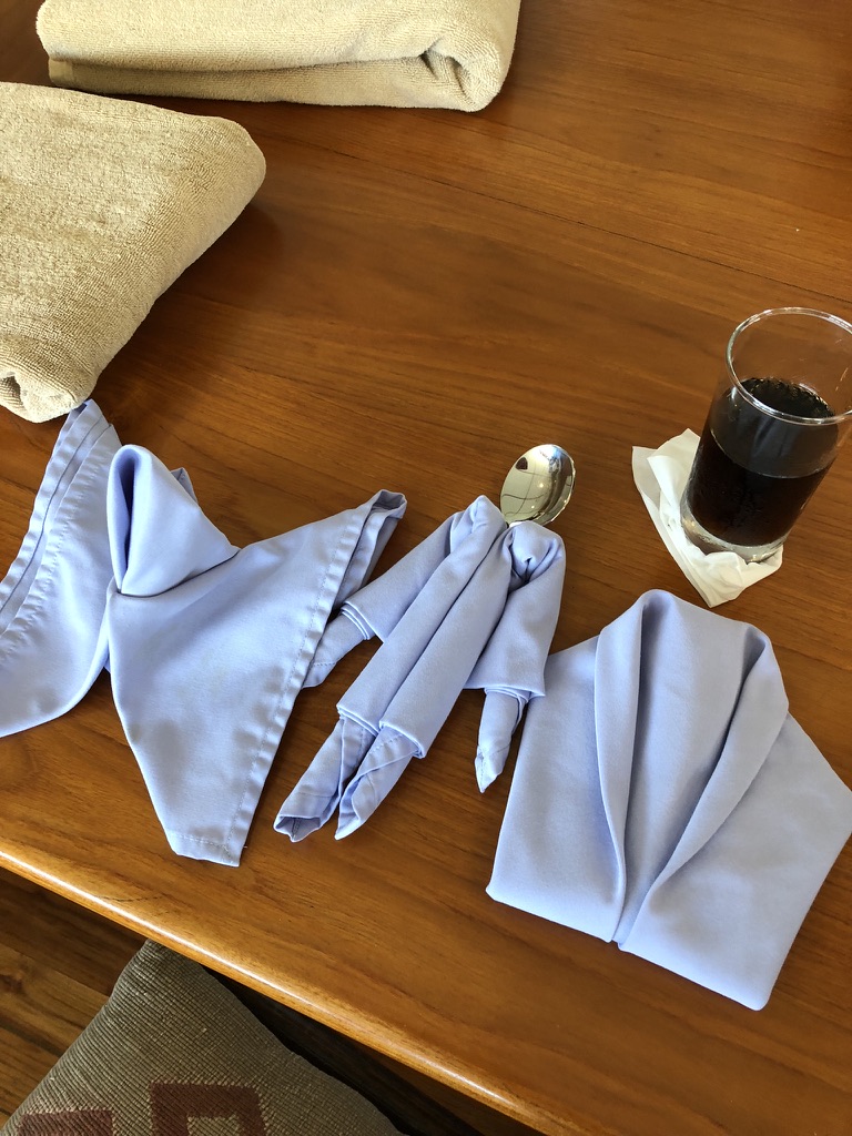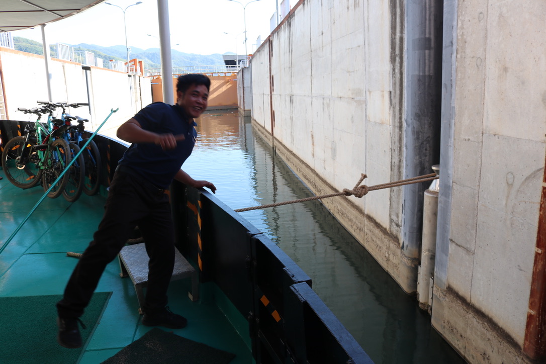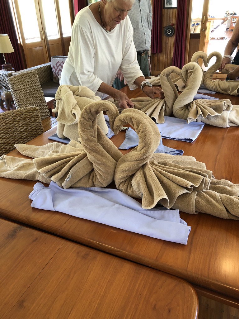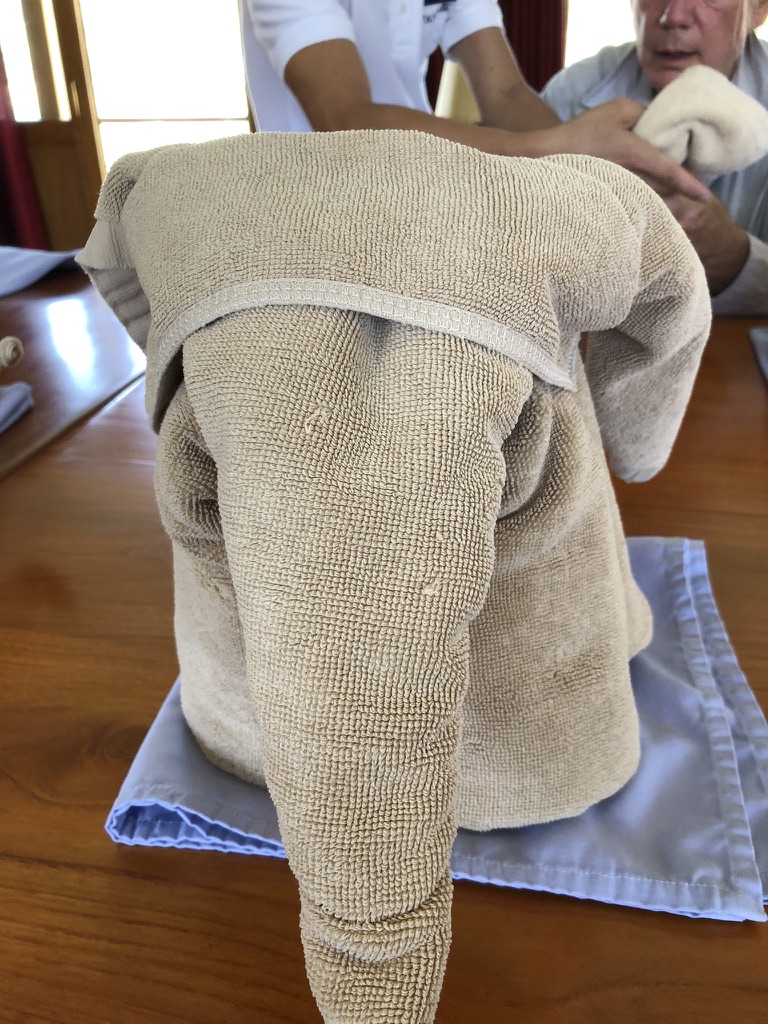 Back on board Gillian had a napking folding demonstration – flowers, shirts, elephants and swans. I read spent time reading. The highlight of the afternoon was passing the Xayaburi Dam with a drop of 40 m through two locks. It is a very controversial construction. On the upstream part of the river the dam has created a deep lake that had required the rehousing of 2,000 people into model villages. The long term effect on the environment is unknown. On the other hand it is an impressive piece of civil engineering to a Finnish design and constructed by Thailand. 95% of raw hydro electricity produced will go to Thailand. The photographs do not do justice in visualising the scale of the project.