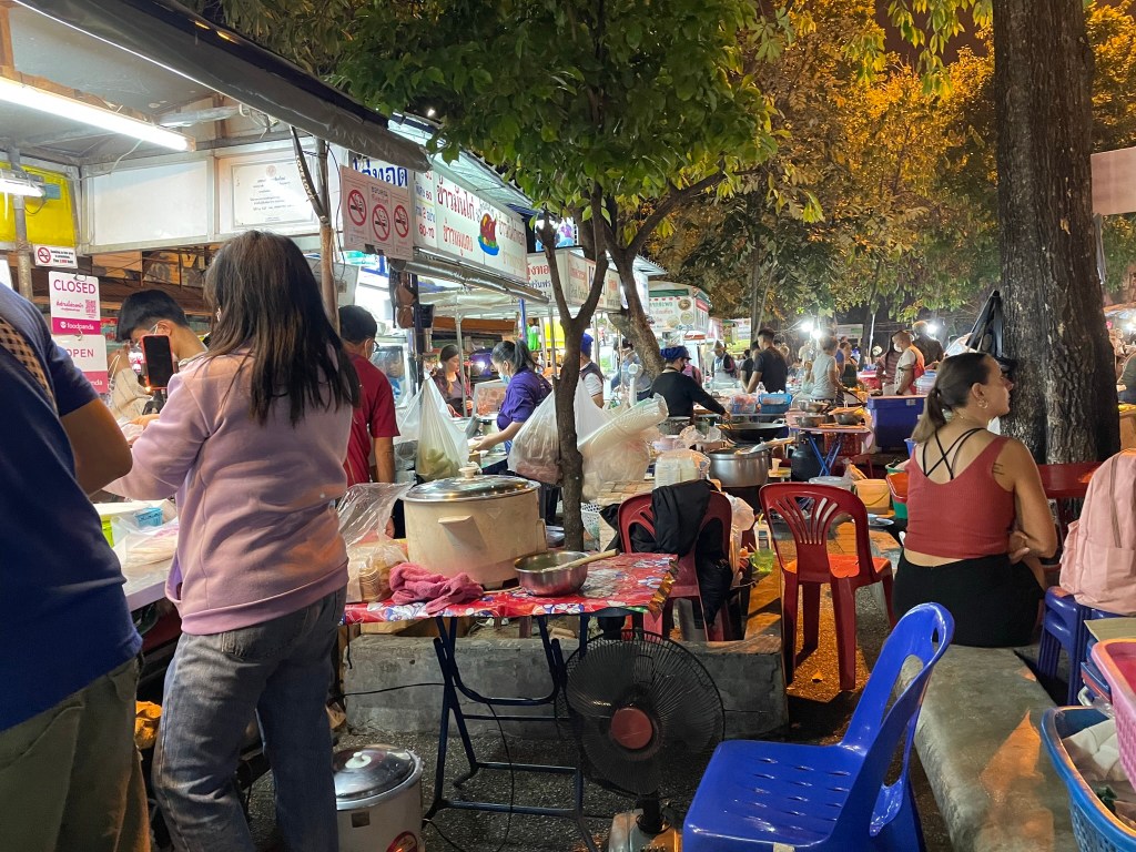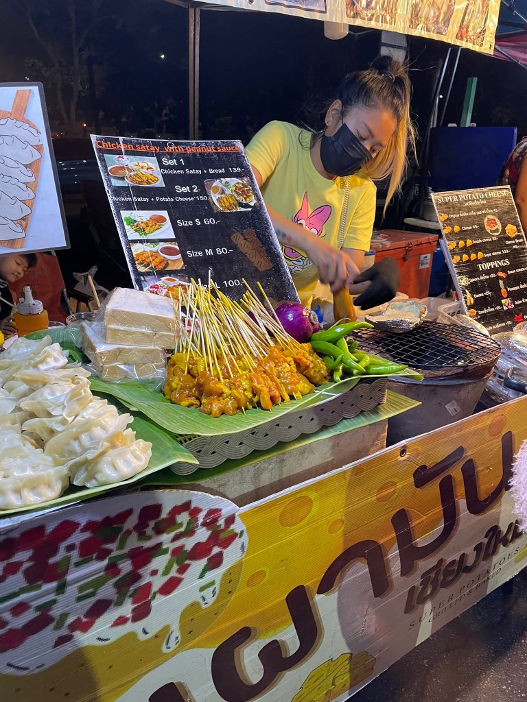 The evening we went again to a night market – this one only being open on a Saturday at the South Gate (Chiang Mei Gate). A short walk from the hotel. Larger than the previous night and busier. But the food was just as nice. We had what are called momo in Nepal – a form of dumpling which had a vegetarian filing. At another stall we had a plate of rice and kale followed by rice with chilli sauce plus chicken. Each plate around 50 baht – £1. There was a bit of hanging around whilst you waited for your meal to be cooked. It was fascinating to see how the stall operated, with the children clearing up, the elder daughter washing plates in three different large bowls of water as well as taking orders and the mother cooking over a wok – none stop. They worked extremely hard for their money.