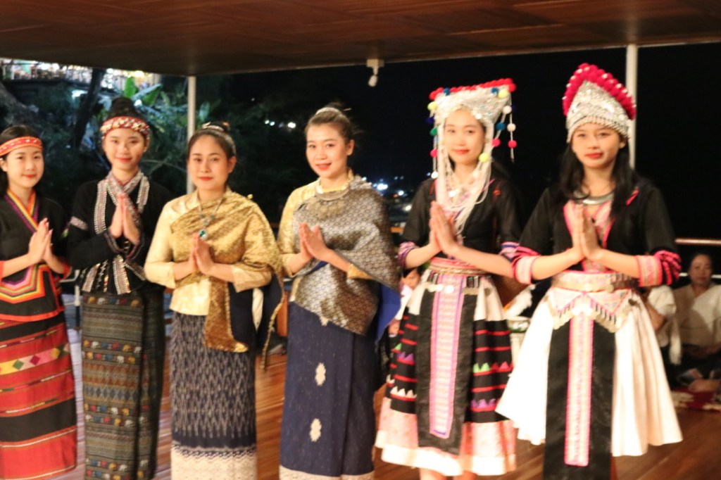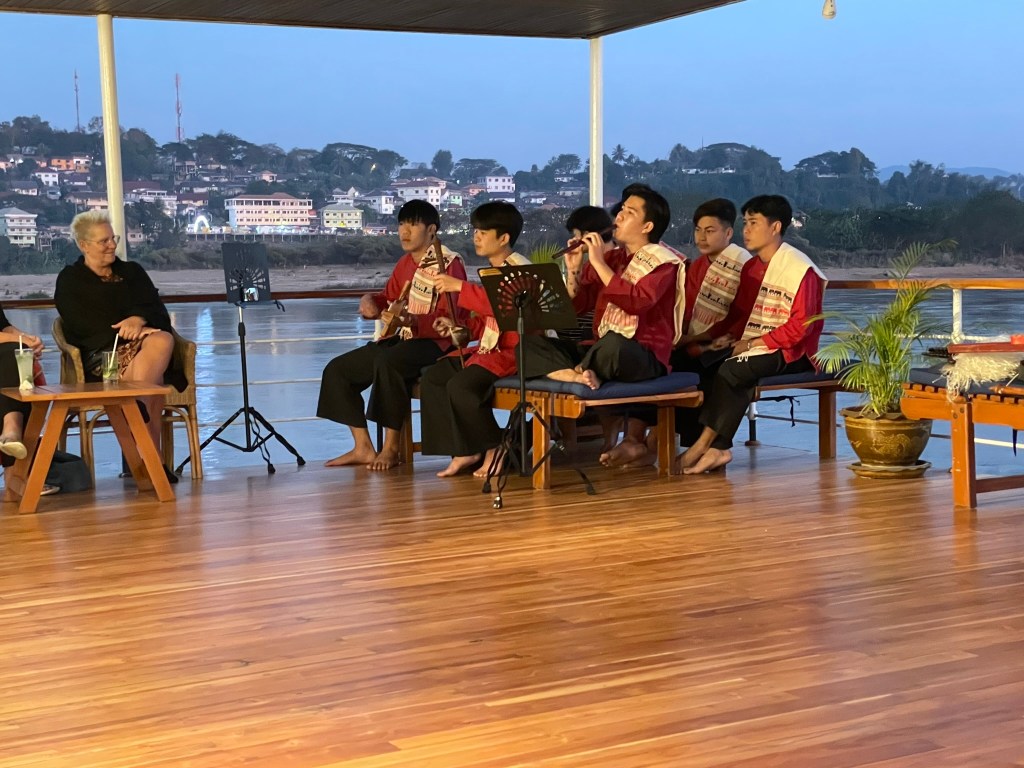 After lunch we finally drove to the boat Champa Pandaw. We were greeted on board by the crew and served with drinks before being finding our cabin 108 – halfway down the starboard side. It was as described and seen in the brochures. Very colonial style – beautifully varnished wooden panels. A large room with twin beds, bedside tables, dressing table, wardrobe and a large bathroom and shower. Upstairs was a covered area with seating down both sides and the dining room. We stayed at Chiang Khong overnight. After cocktails a group of traditional Thai dancers from the Hmong tribe performed for us – a group of female dancers and a male orchestra. Inevitably we are all persuaded to dance but in a sympathetic way. Our first dinner on board provided an opportunity to meet our fellow guests – Australia, Germany, California as well as UK. A few single people some of whom had paired up – all of a similar age group.