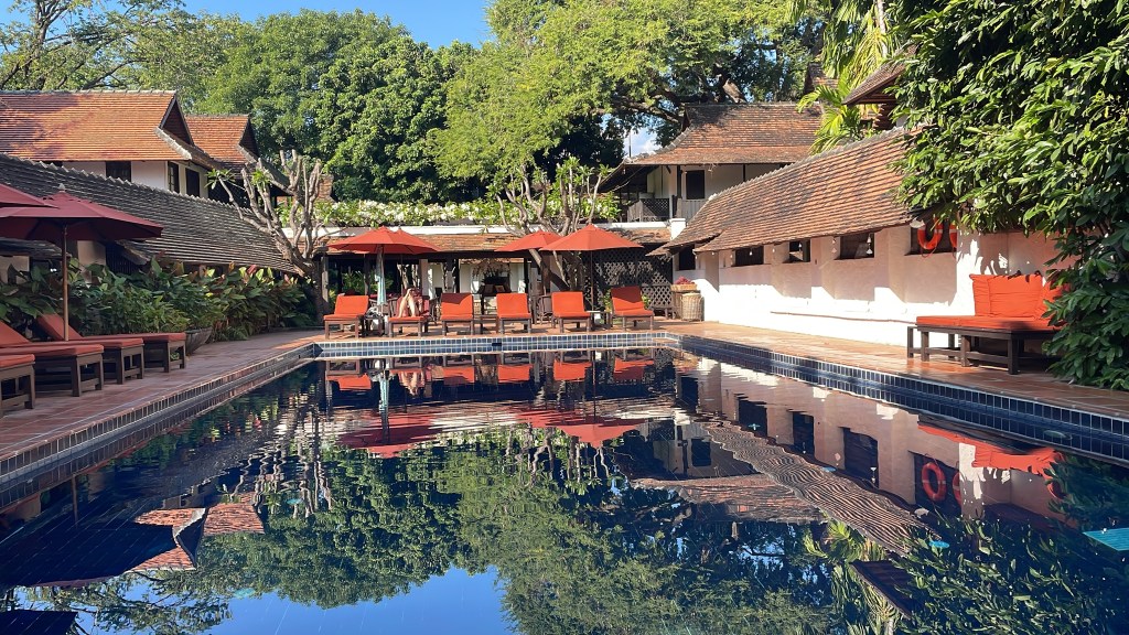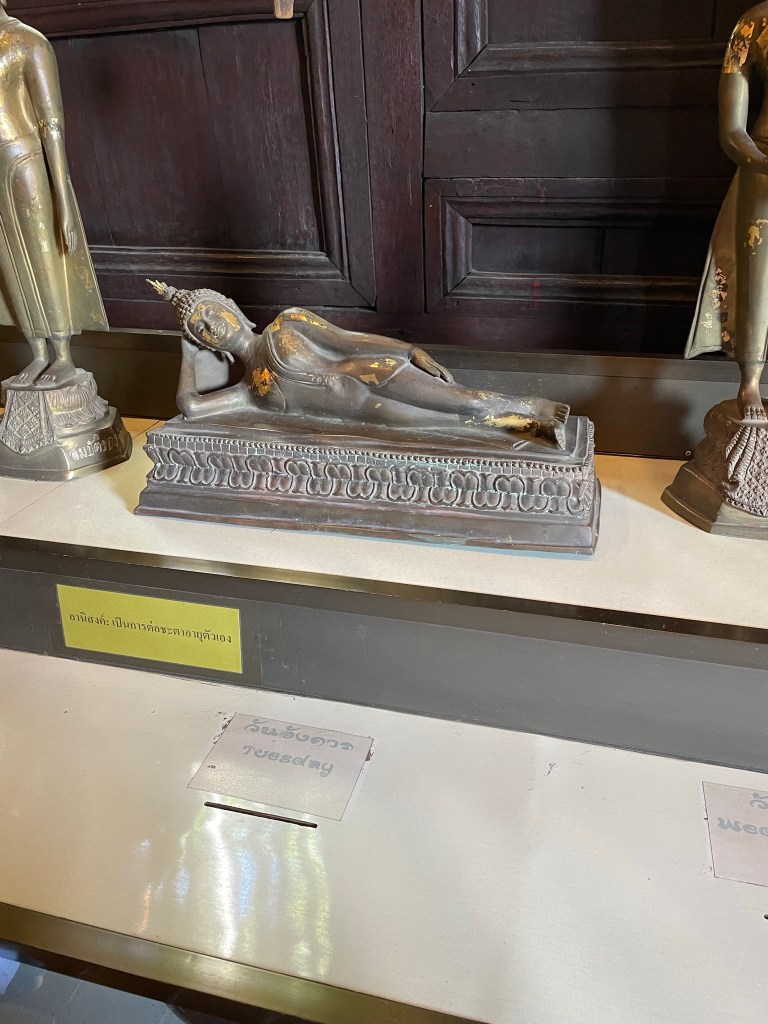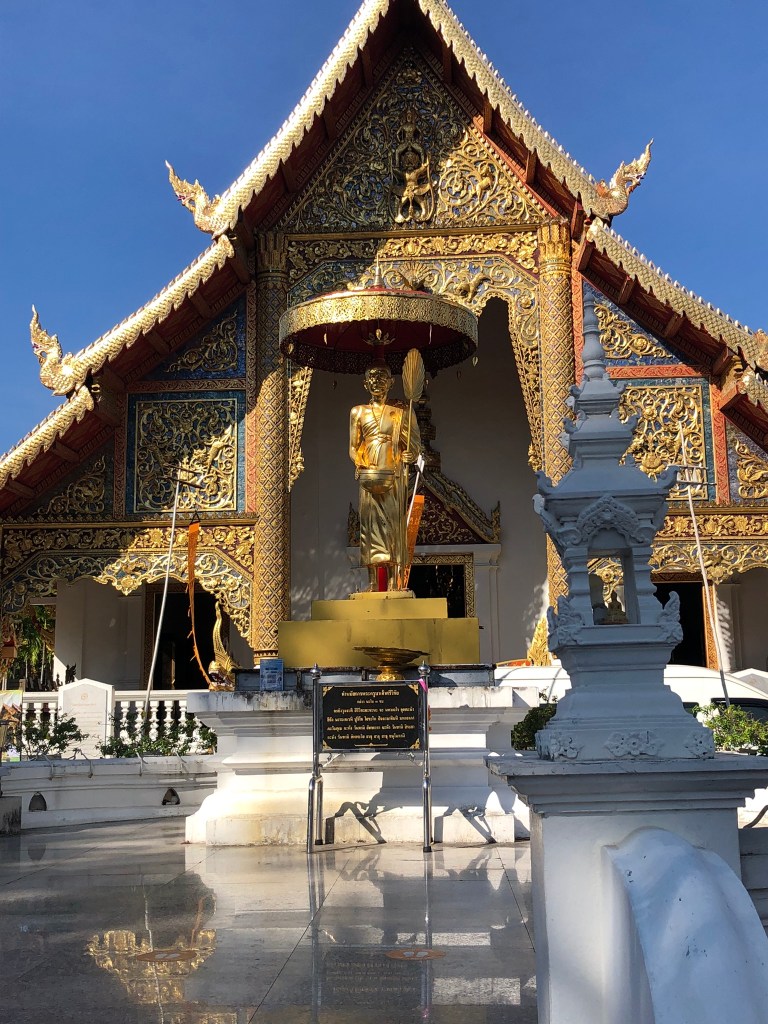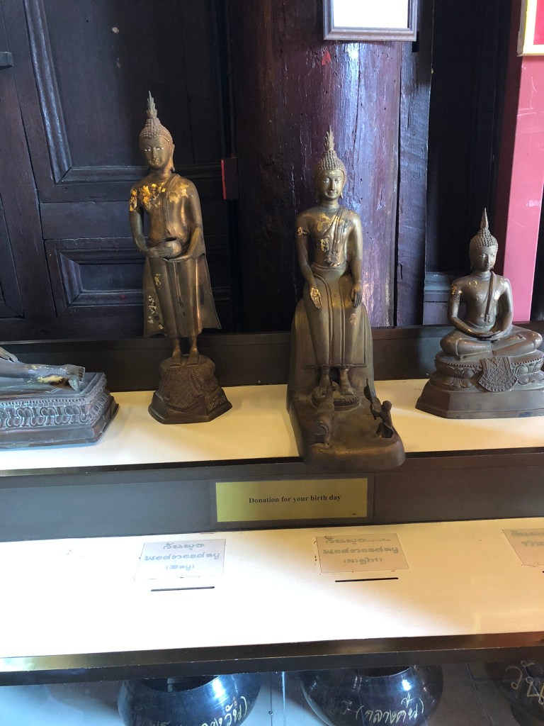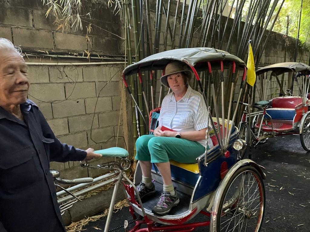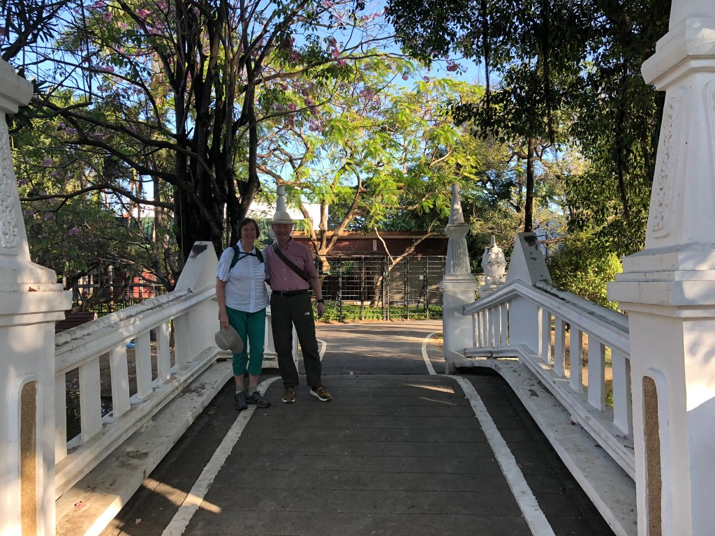This was gong to be a busy day. We were picked up by Amy at 0800 and were joined by Joerg and Gaby – both German. The tour in the morning was via rickshaw – one of us to each tricycle, the oldest rider was 80! We were taken down to the public park where they were playing a Thai version of volleyball – Sepak Takraw – they could only use head, feet and elbows – extremely athletic. A lot of people walking, running and exercising in a very civilised way. From there it was to the first temple – Wat Phrasingh. The beauty and spiritual feel to the temples is hard to ignore whatever your religious beliefs. Although the one aspect that felt out of kilter with Bhuddism was the ability to pay your way to ‘heaven’ – fast track as our guide called it. This effectively disadvantaged the poor – not really in keeping with the principles of Bhuddism. Following this temple which was rich in symbolism we were then taken to War Pan Tao – this is a teak temple built in the 14th century. Amy asked each of us our birthdays and identified which form of Buddha to which our character was similar. Mine was Tuesday – and Gillian Wednesday.